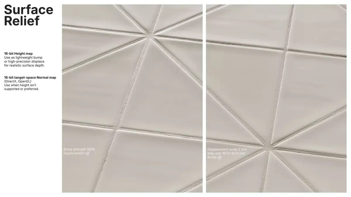 Surface relief is provided by a RAW 16-bit height map tuned for a true 3 mm depth (1872x1872 mm surface), suitable for lightweight bump or precise displacement. A 16-bit tangent-space normal map (DirectX/OpenGL) is included for cases where height-based workflows aren’t preferred.