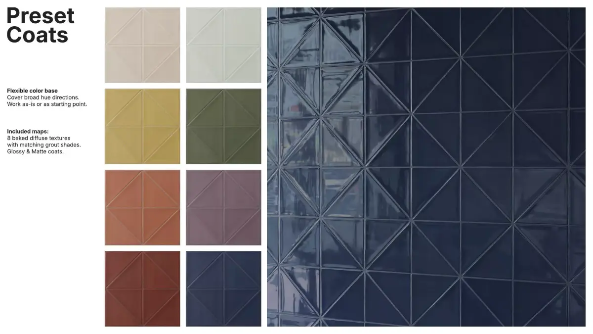 The package includes 8 diffuse variations with matching grout tones, and a flexible color base that works out-of-the-box or as a starting point for custom looks.