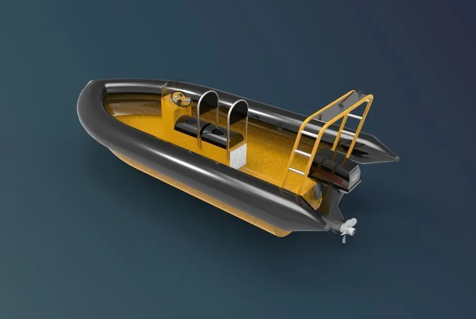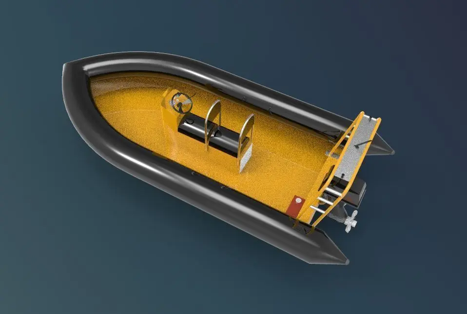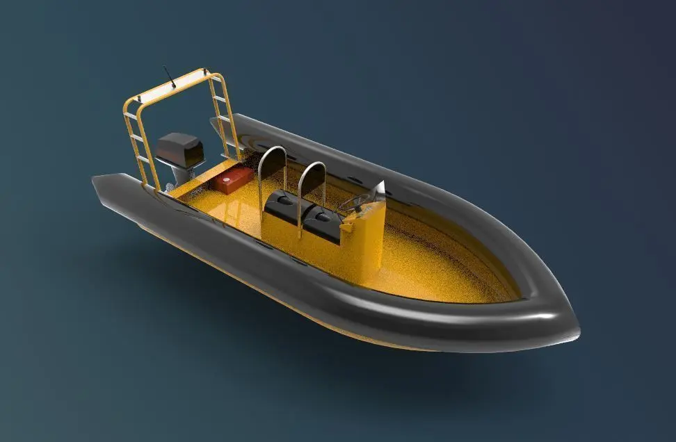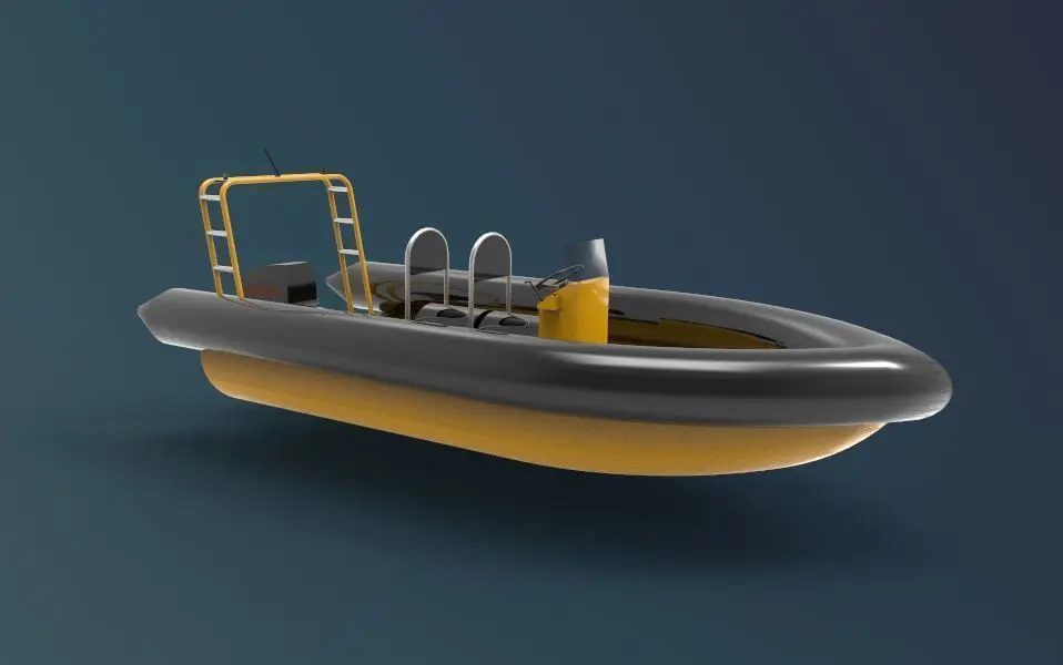 The 3D model of a rigid inflatable boat (RIB) reflects the unique design that combines a rigid hull with inflatable tubes along the sides. This model emphasizes the sturdy and robust hull structure, typically made of fiberglass or aluminum, for stability and speed. The inflatable tubes are modeled with realistic texture, showing the durable material that provides buoyancy and impact resistance. The boat's deck layout is detailed with seating areas, grab handles, and an intuitive control console for easy maneuverability. The model also includes additional features like a motor mounted at the stern, which is carefully detailed to represent its horsepower and design. Overall, the 3D model of the RIB boat captures the practicality and resilience that make these boats ideal for various water-based activities, from rescue operations to recreational outings.