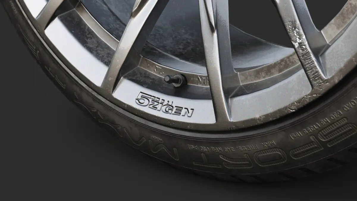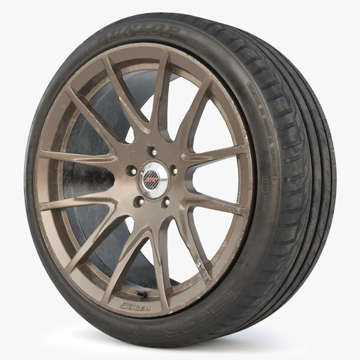 PBR Low Poly 3d model of car rim by Japan brand 5Zigen and Tire Dunlop Sport Maxx.There are 2 meshes and 2 texture sets for tire and rim separately.The tires are asymmetrical, so there are 2 meshes for the left and right in the scene. As well as 2 copies of rims with different finishes.This model uses the metalness PBR workflow and includes 4k PNG files for the following: