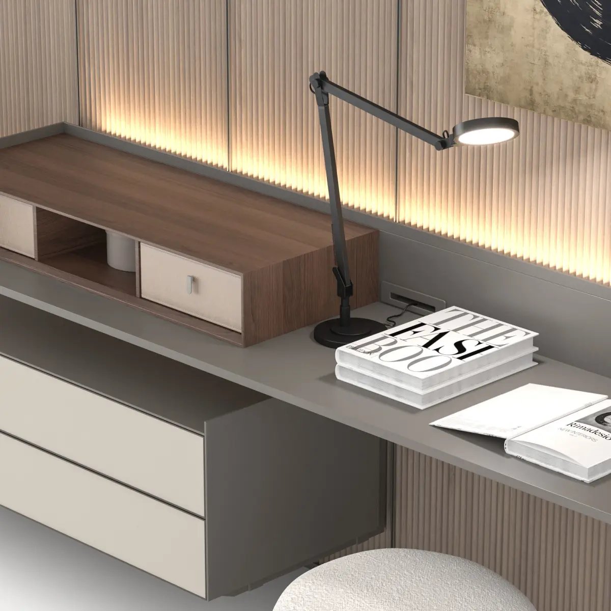 The composition includestable Rimadesio Self planwall panels Rimadesio modulorshelves Rimadesio Eossideboard Rimadesio Self bold Length: 5322 mm, Height 2800 mm. width 580 mm.