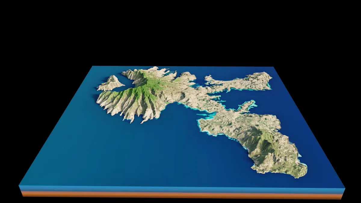Komodo Island full 3d terrain. 3d model landscape of the island of Rinca with its landscape of mountains, beaches and forests
