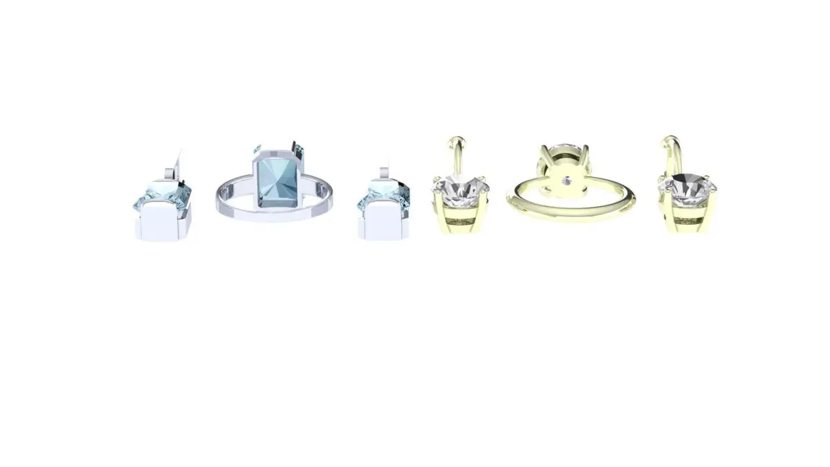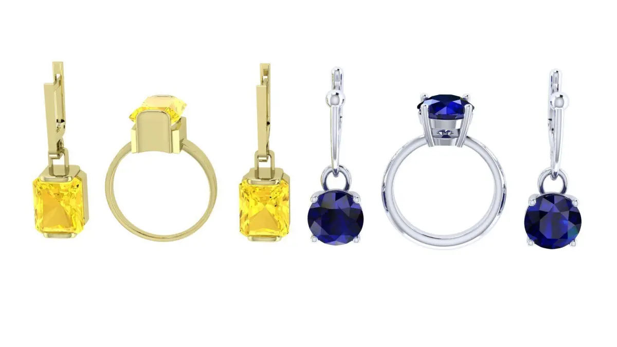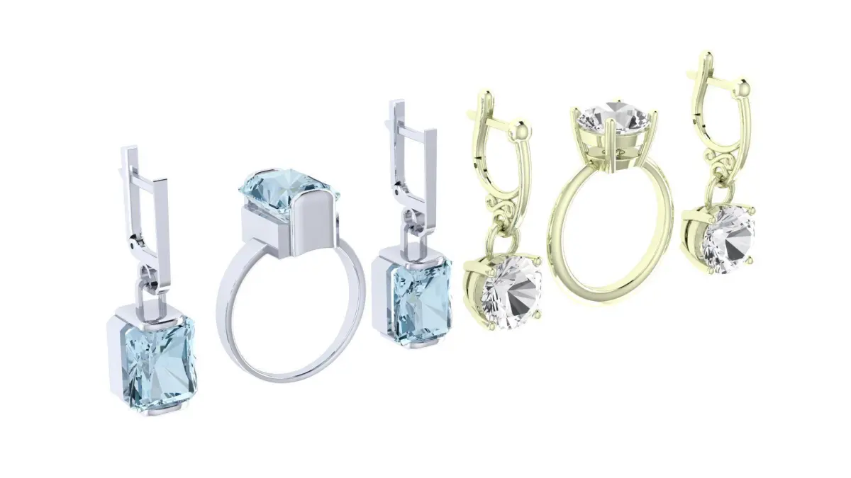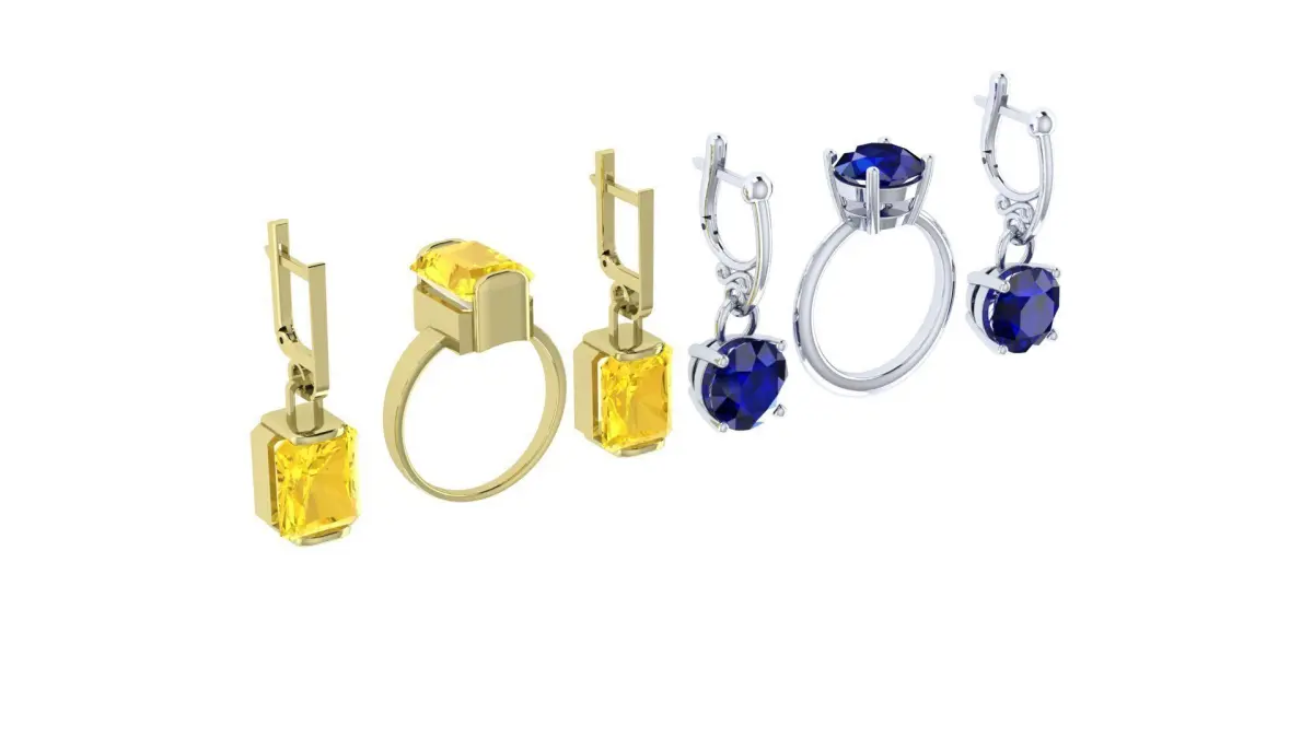 Two sets of rings and earrings, with a minimal set of decorative elements and with a light construction.The rings consists of one piece, and the earrings consists of three parts: an English lock of two parts and a frame for a stone.The set includes two sets, one of which uses round stones with a maximum diameter of 12-13mm, and the second, rectangular stones measuring 12mm x 10mm. The original design allows you to improvise with a choice of metal and its color, as well as with a choice of precious and semiprecious stones and their color. The models is presented in the STL format and is ready for printing.