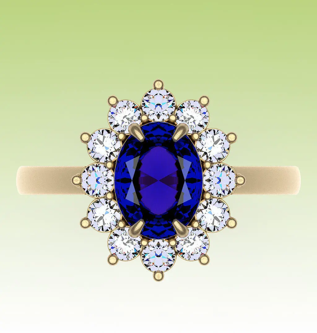 Classic ring with oval-cut center stone and halo. Analogue of Princess Diana's ring