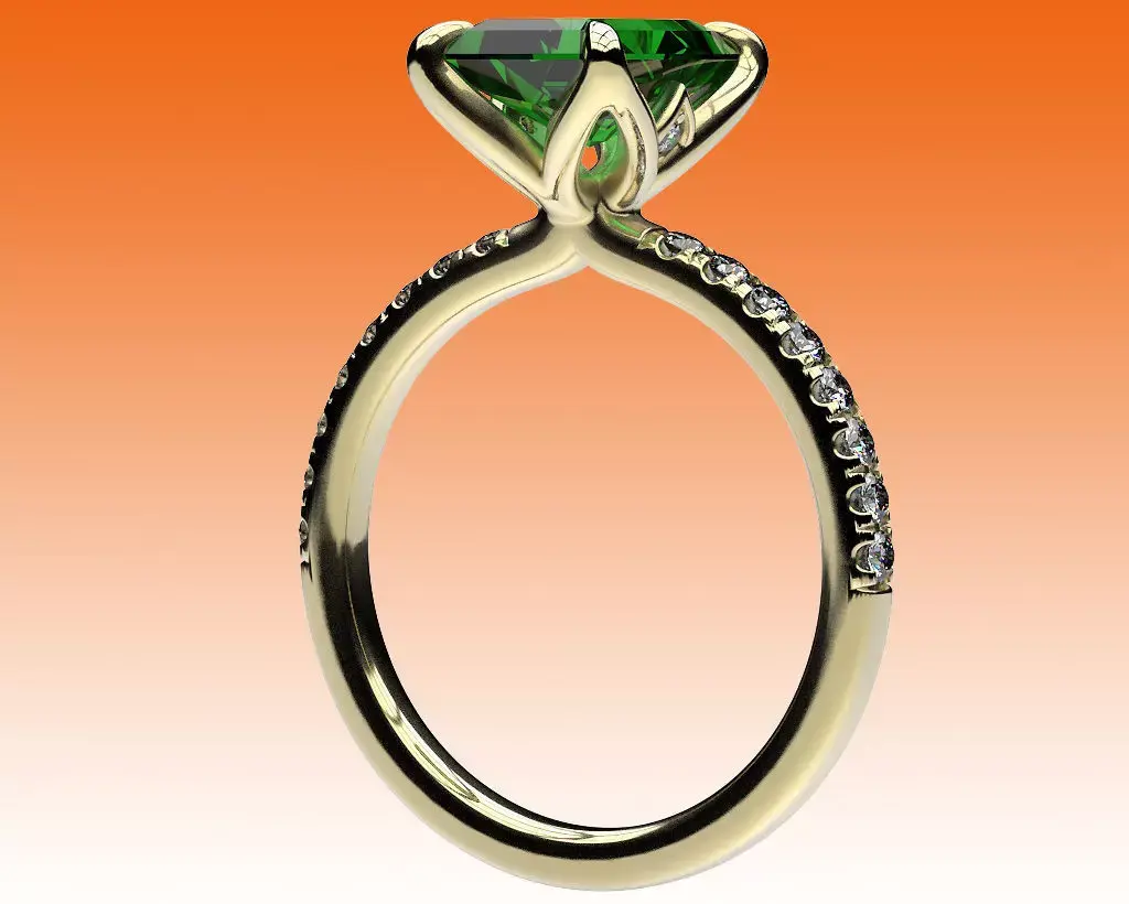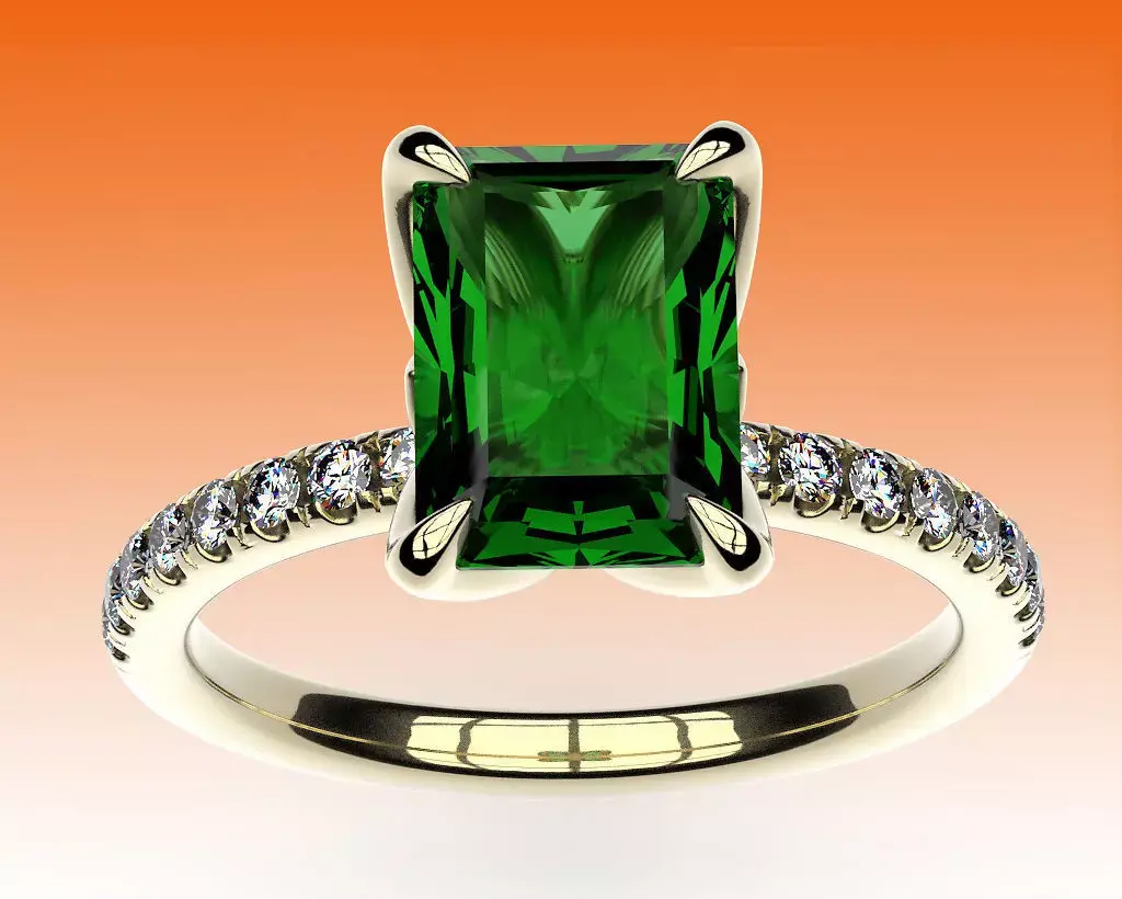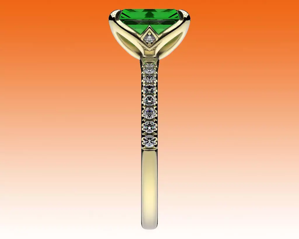 A classic engagement ring with an emerald-cut center stone, pavé stones on the shank, and a small secret - a pair of stones under the center stone.