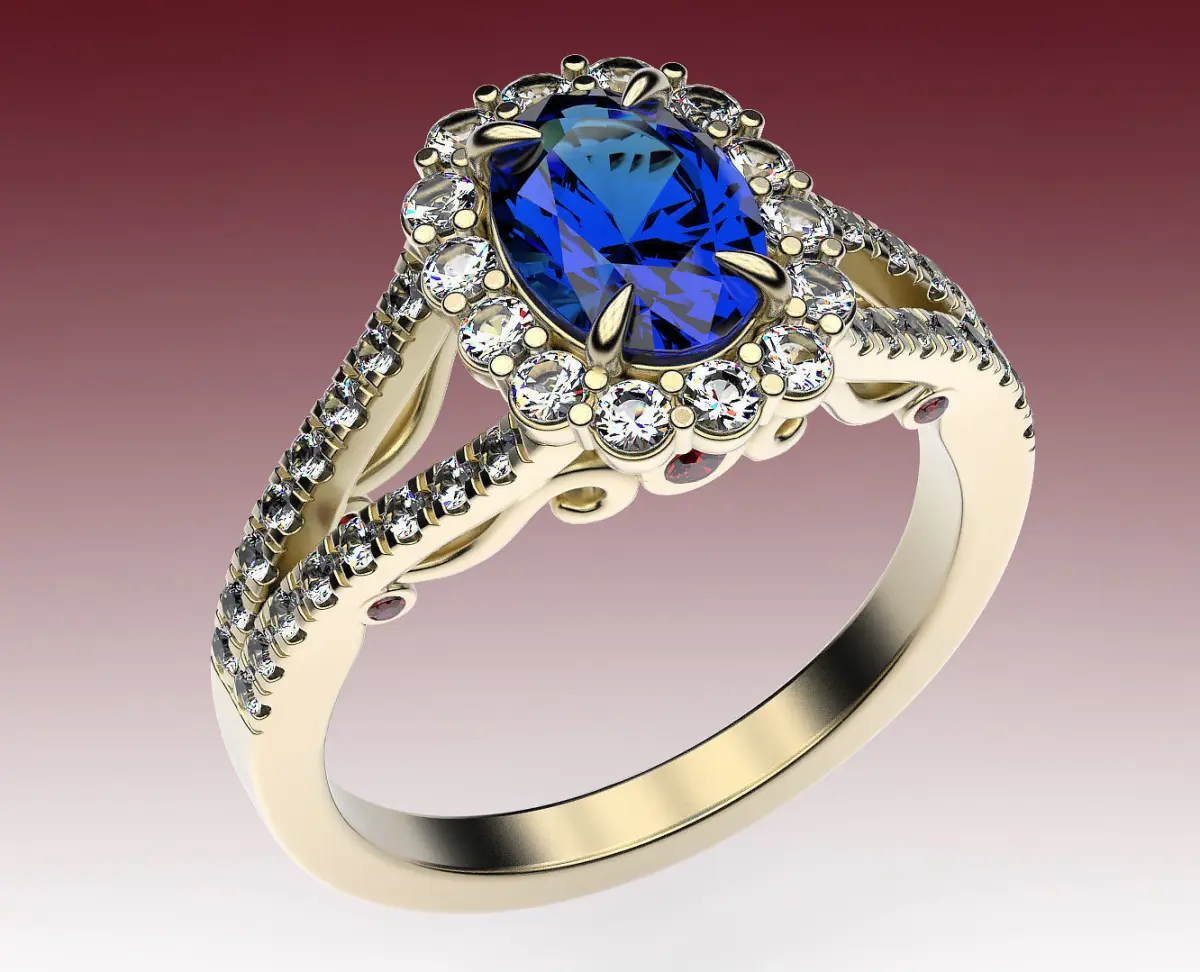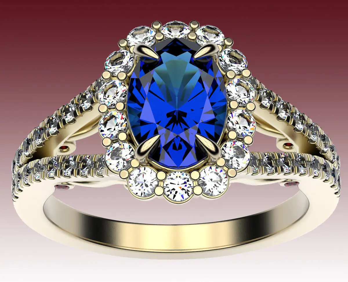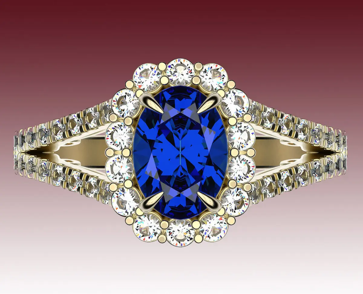 Classic engagement ring with an oval cut center stone with halo and pavé of small stones throughout the shank