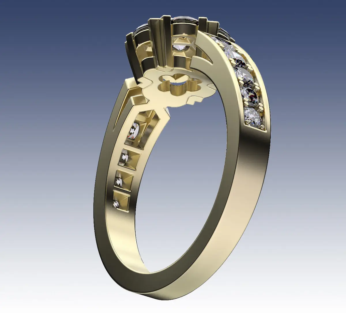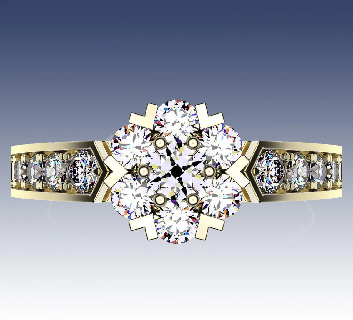 The ring's design combines seven round-cut diamonds into a dazzling circlet. There is pave stones along the shank, the inside of the ring is decorated with azure