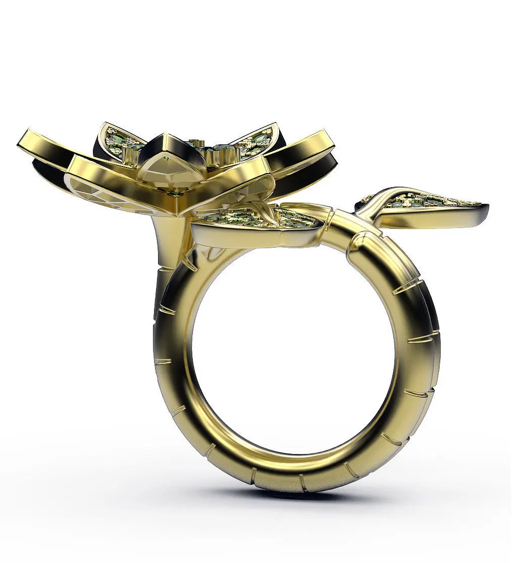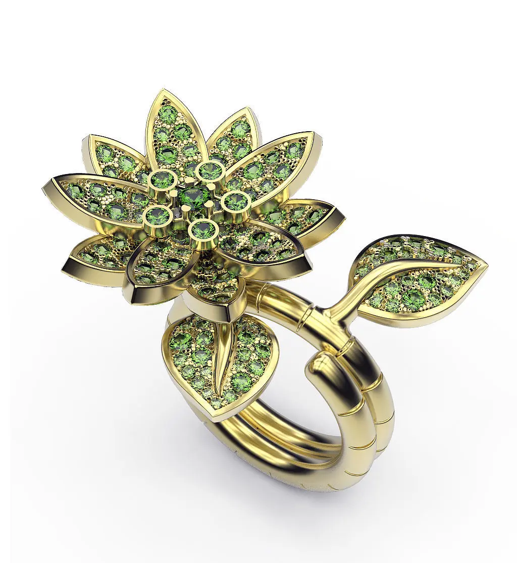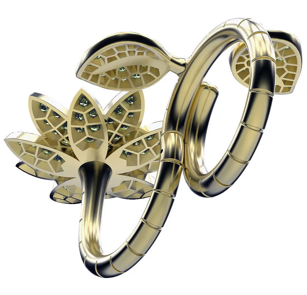 A transformer ring with motifs of a bud and lotus leaves studded with small precious stones. The ring can be worn on one or two fingers.