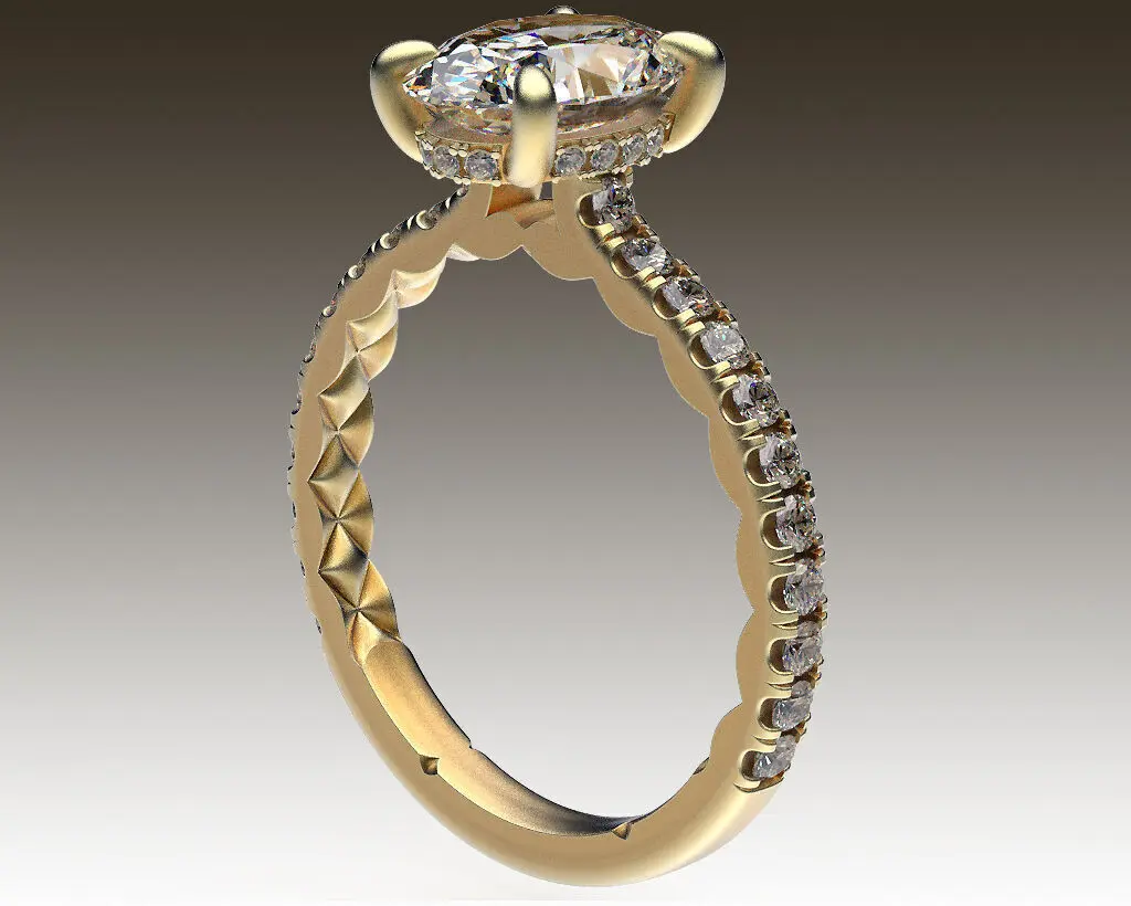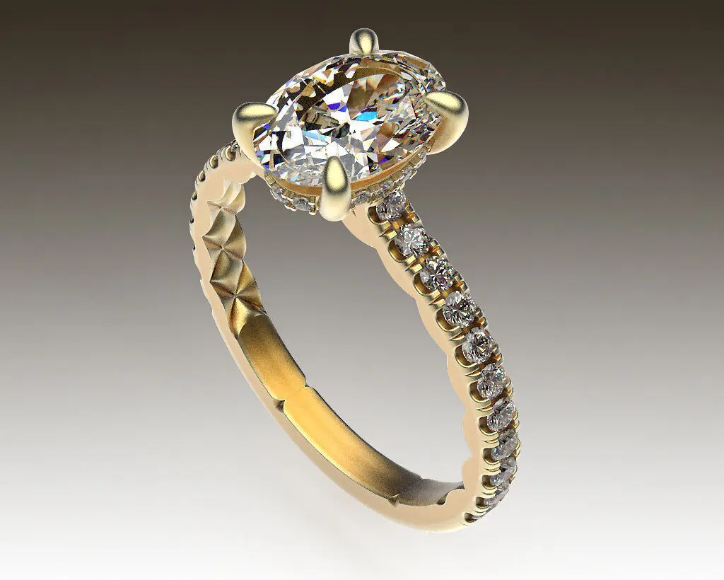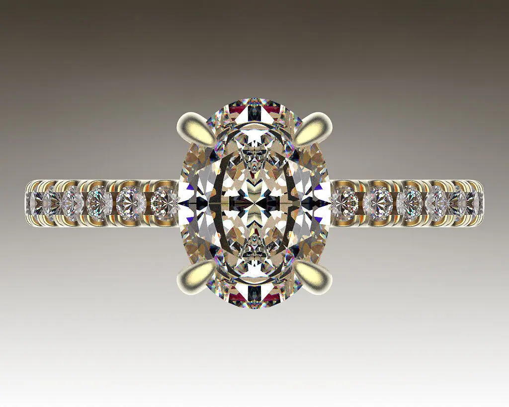 This beautiful oval solitaire diamond engagement ring shines with pave diamonds along the shank
