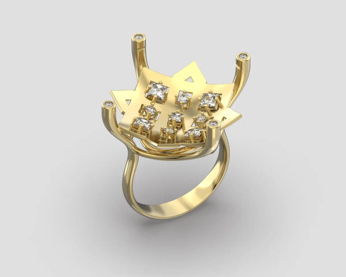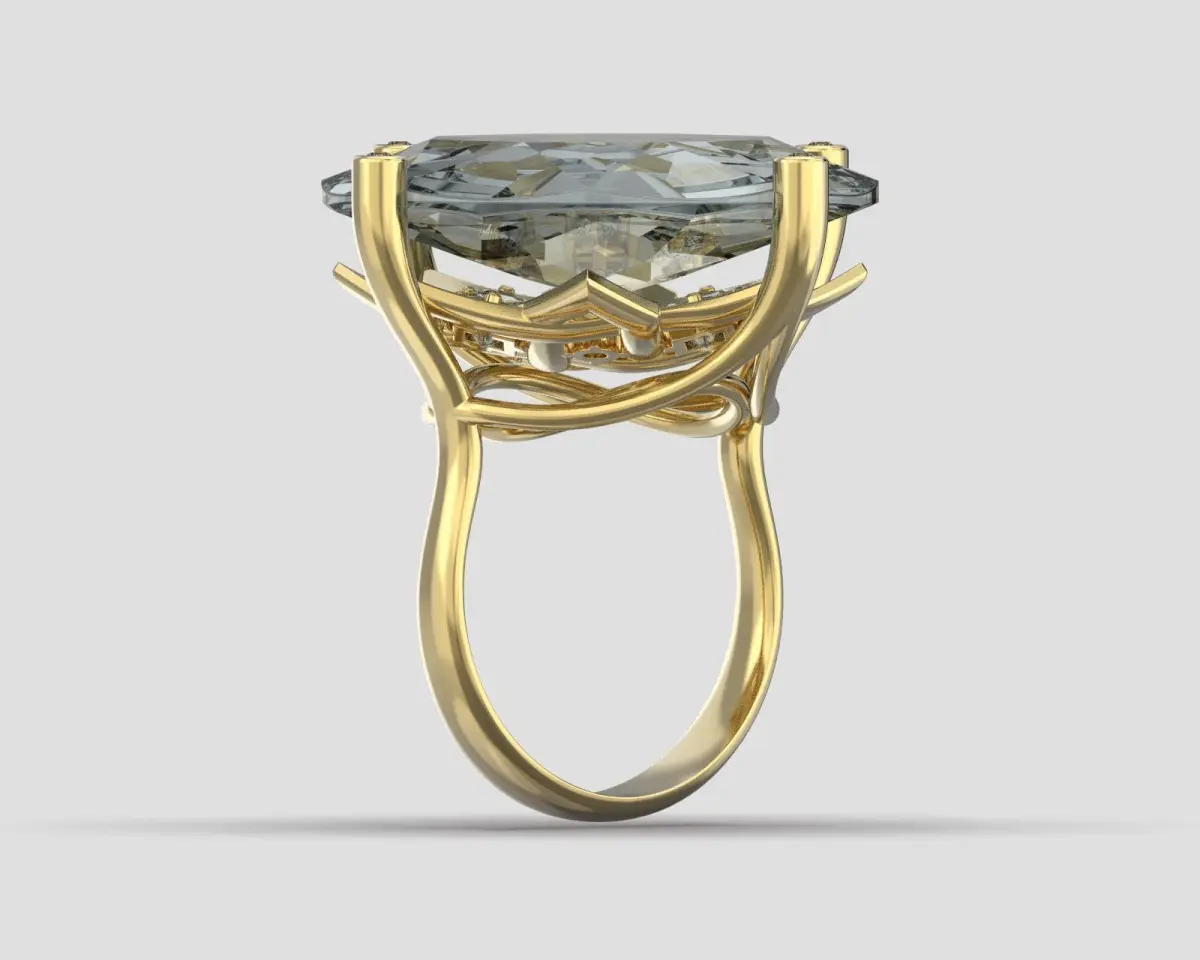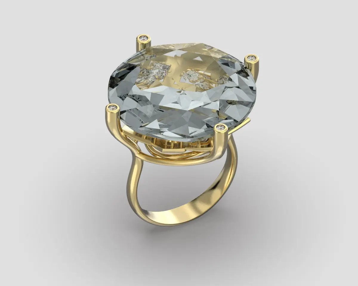 Ring with big transparent stone through which is seen ornaments around shining stones.