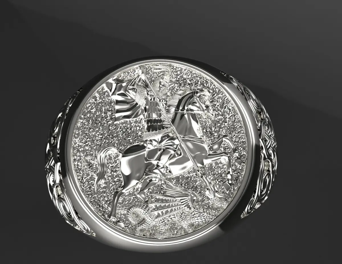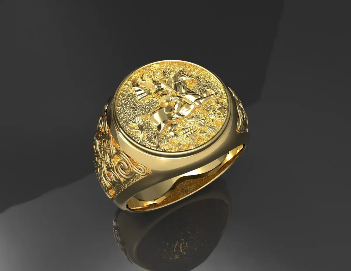 Dynamic Pose:The rider's pose suggests a sense of unity and partnership with the horse, creating a dynamic composition that resonates with lovers of equestrian art. The details, from the flowing mane of the horse to the rider's posture, contribute to the ring's overall sense of movement and life.