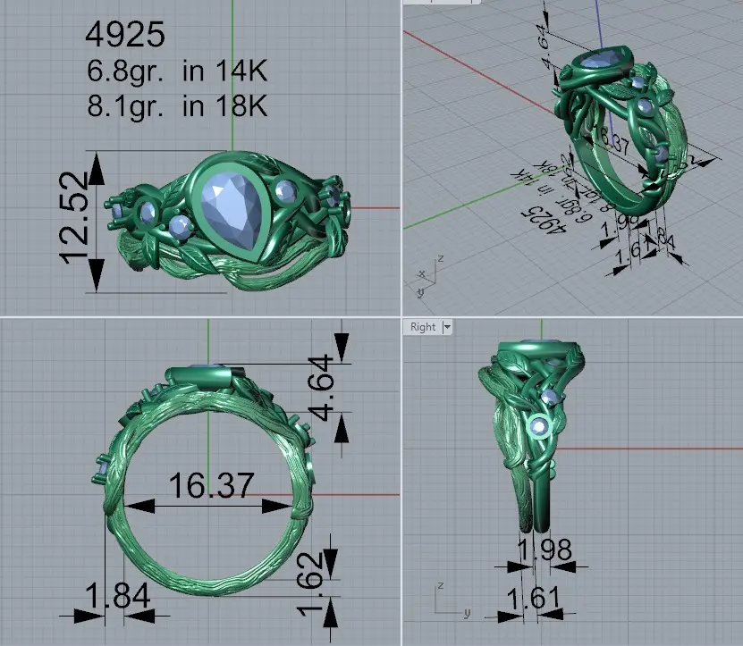 Ring with pear bezel head leaves and branches 4925,3d printable model.