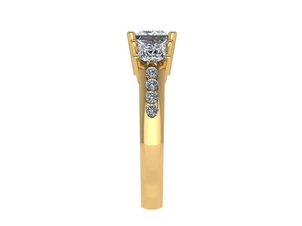 While the round brilliant cut may be the most popular diamond shape of the bunch, the princess cut maintains the fire that makes round brilliants desirable while boasting a timeless and modern geometric silhouette. This ring comes with three stone, and it's rich with symbolism and personal significance. The three stones traditionally represent the past, present and future of a relationship, but can also be interpreted to stand for friendship, love and fidelity or even take on religious significance. For those looking for a ring with deeper meaning, a three stone engagement ring should be at the top of your list of options to consider. With round channel gems by side, this piece catches light from every angle. Heart details give a dose of sweetness and romance to this piece.
