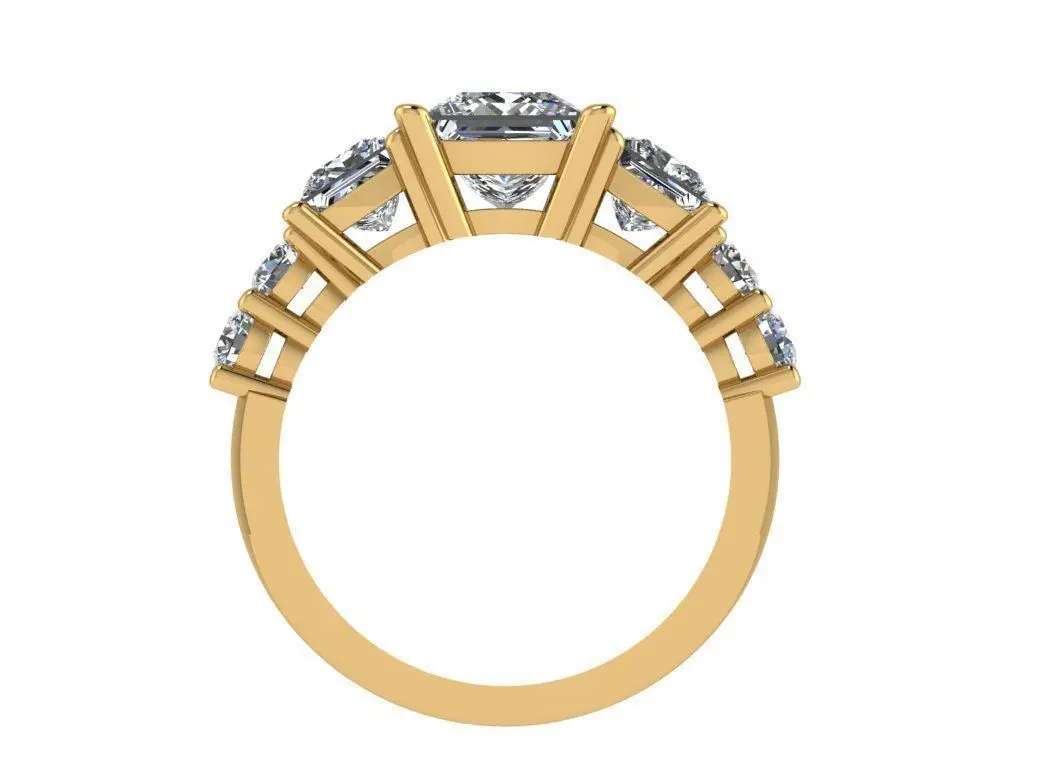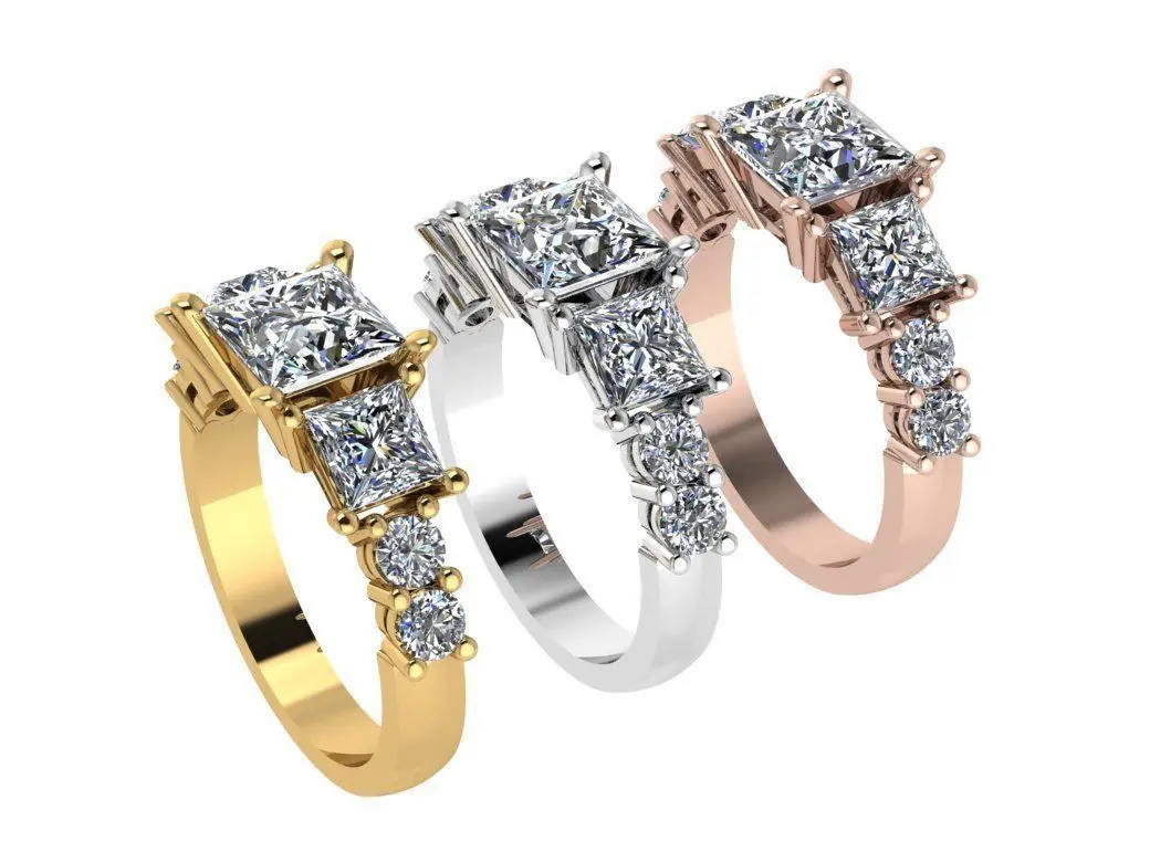 Princess cut diamonds are the epitome of a modern, cool look with an undeniable classic charm. And if you have three princeess cut diamonds, you're really lucky bride! The three stones traditionally represent the past, present and future of a relationship. With a princess cut diamond, you’re blending a modern, chic, and classic style with sharp lines that feel fresh and sophisticated. The abundant brilliance, fire, and scintillation of this cut are like the icing on top of a very delicious cake. This diamond shape is glowing, rich, modern. Versatility of this diamond shape is just one of many reasons to love it. It came with round diamond by the sides, to make the ring more sparkle and luxury.
