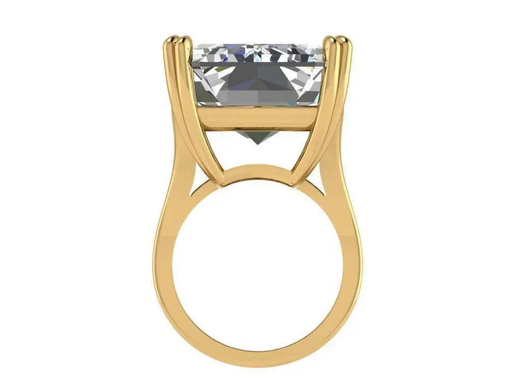 The Emerald Cut Diamond provides for deep clarity and a large surface table. Through its long step cuts, the diamond offers abundant reflections both of white and colored light. Emerald Cuts are more prominent in rectangle but are available in square as well. More and more brides are gravitating toward emerald engagement rings due to the nontraditional nature of the shape. While this stone shape is rarer, there is still a range of options for the style. This cut brings a lot of light into the center of the stone. This geometric ring boasts an unique feel with a sparkling white brilliant-cut center stone in a four doubled prong emerald setting. If you are lover of extra big stones, this is the right choice for you. You can make it in yellow, white or rose gold.