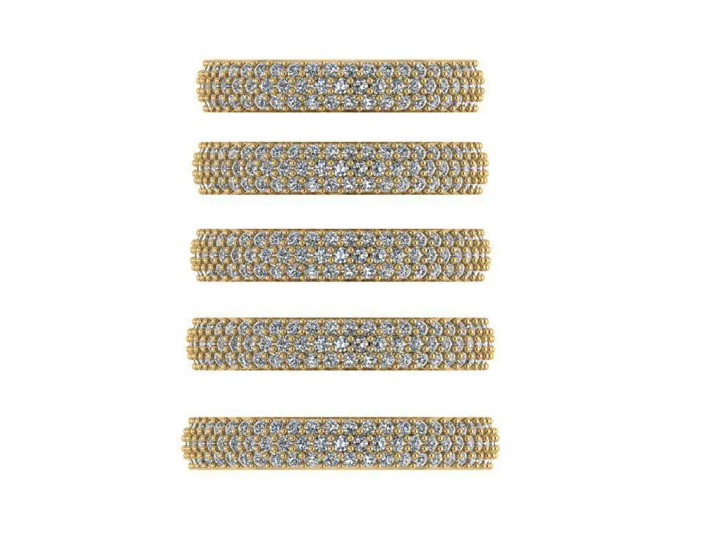 - Just because there isn't a solitaire doesn't mean you have to miss out on all the bling. Shine bright like a lot of diamonds in this full-diamonds gold band. This piece makes a statement in any room you walk into. This is lovely and timeless piece that you will allways love. Show off your love of diamonds with this fabulous trio of sparkling rows in 18k gold in prong setted round diamonds that catches the light in every side. We recomended this model for daily wear, because of it's classy and timeless style. You can make it colorfull or full of white gems, rose, yellow or white gold, like you want. If you are classy lady who prefer shiny accessories, this ring is just for you. In this file you got five identical rings in different shapes.