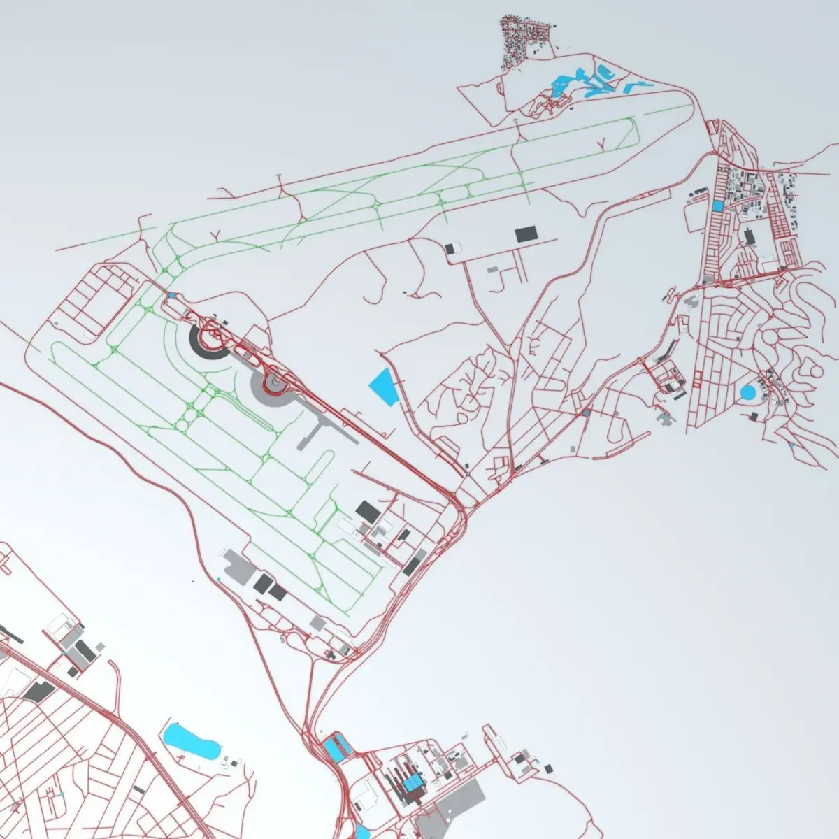 UV mapped with overlapping UVs - no textures included / colors setup by materials (can be changed in any 3D software) - the model is positioned on a flat surface (road network is on the “floor” - no elevation data included) - geometry is polygonal quads and tris - model is untextured and renders fast