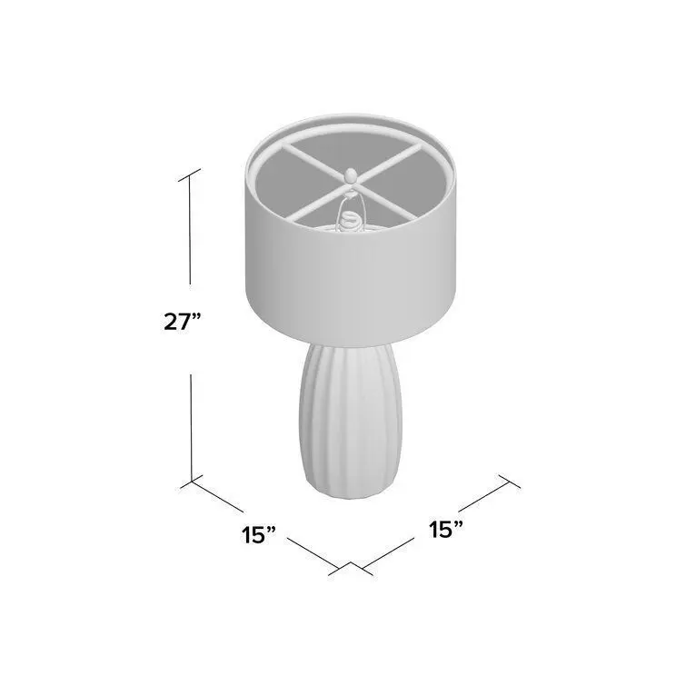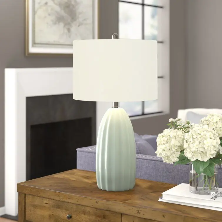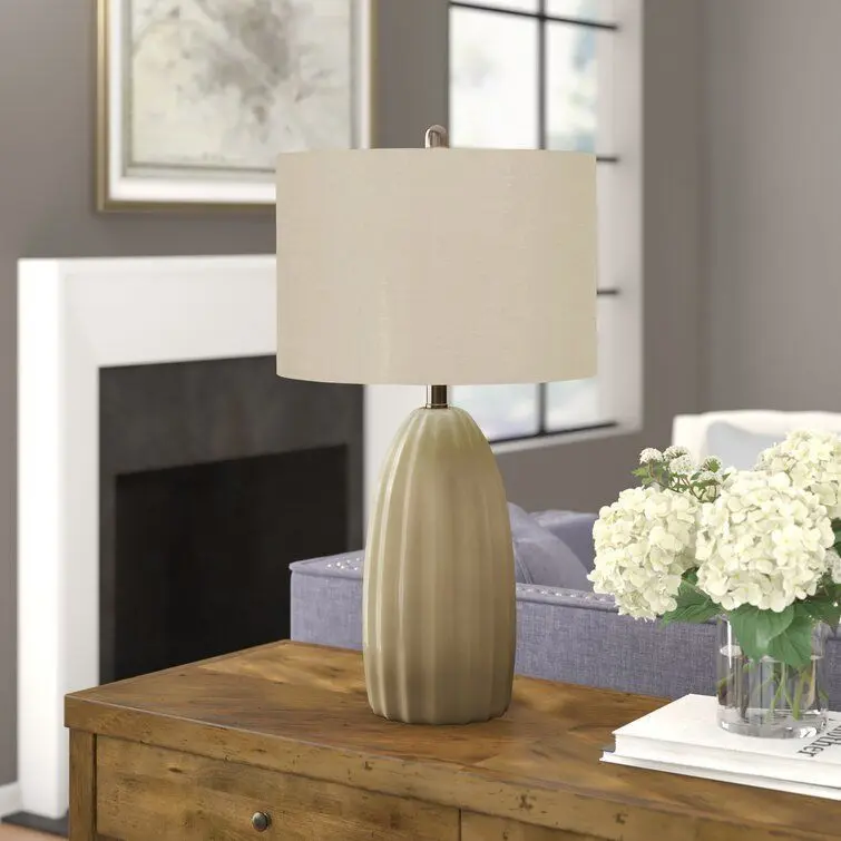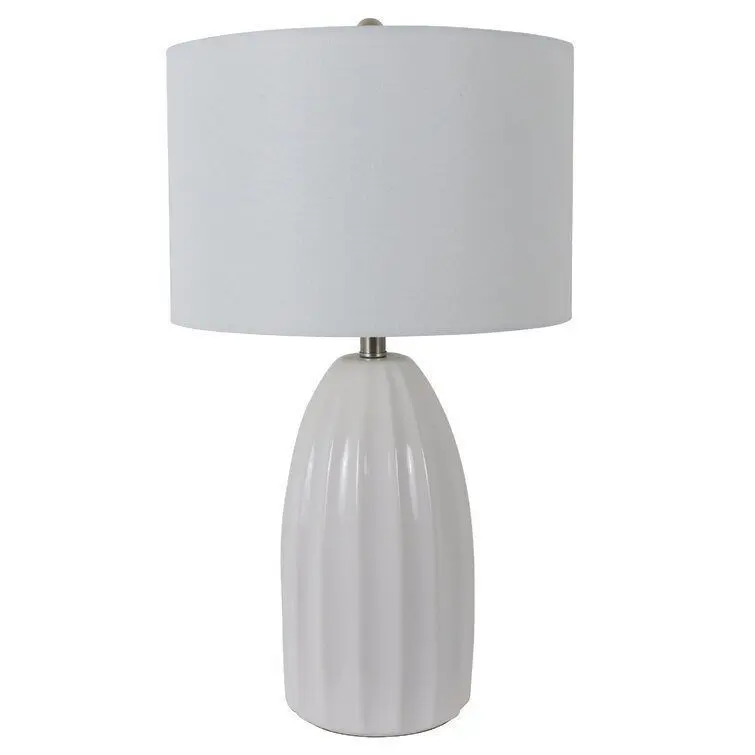 - Bring brightness to the bedside or reading nook with this versatile table lamp. Crafted from ceramic, its body strikes a streamlined silhouette with carved grooves and a high-gloss finish, creating a traditional look in any space. A white linen drum shade up top introduces a contrasting touch of texture as it spreads the light of a single bulb (not included) throughout your ensemble. This lamp accommodates 150 W maximum bulbs.