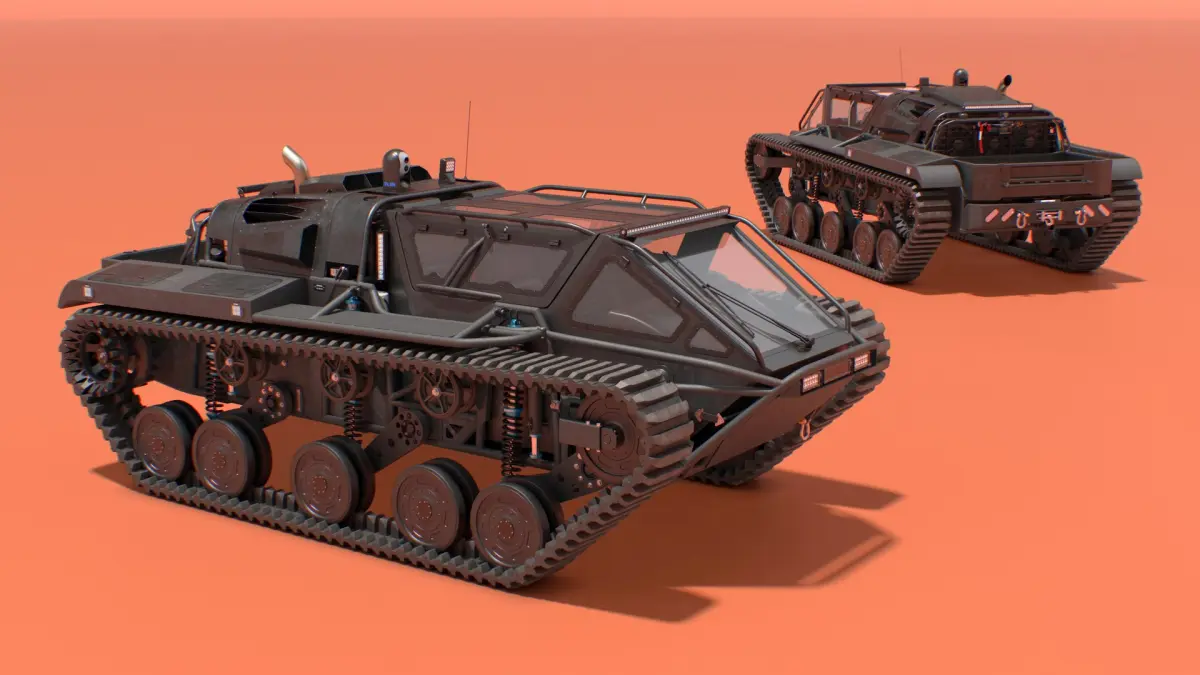 This model features a robust tracked system that ensures stability and traction across uneven landscapes. The vehicle's open cab and durable construction make it ideal for carrying equipment or passengers in off-road environments. Equipped with suspension systems, it offers a smooth ride, while the streamlined design enhances maneuverability.