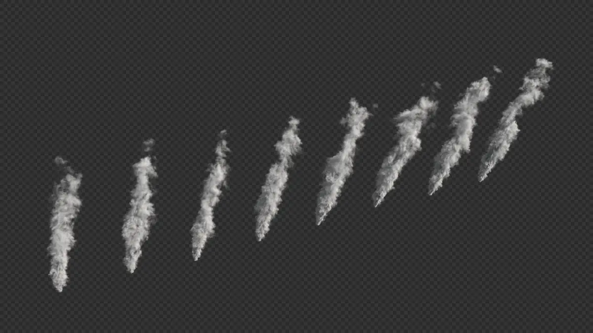 A set of 8 realistic volumetric clouds in OpenVDB format. They are rising upwards and dispersing in the atmosphere. Suitable for use as steam or smoke clouds.