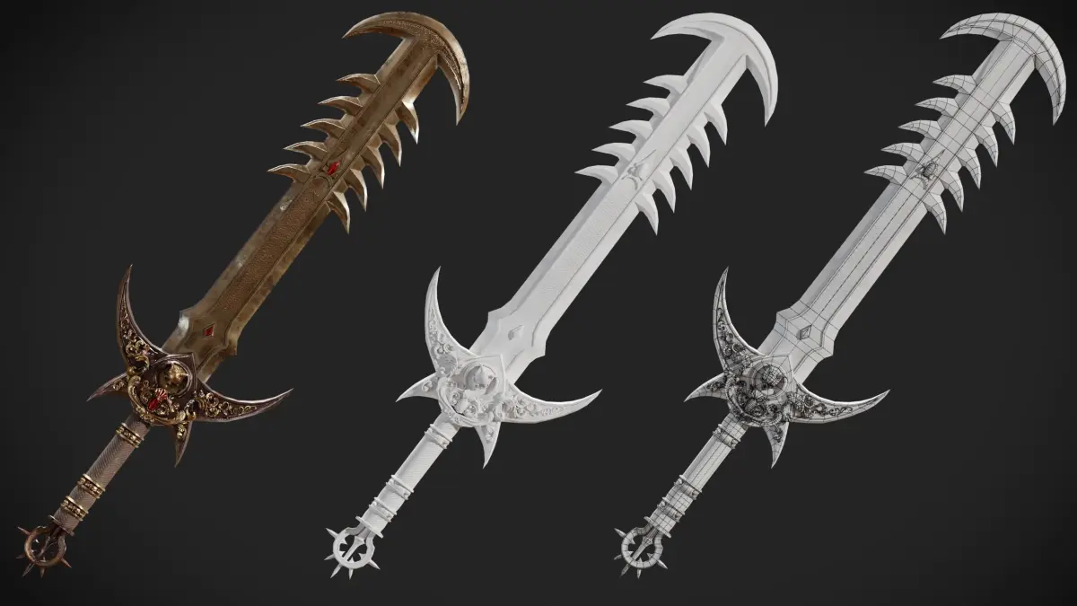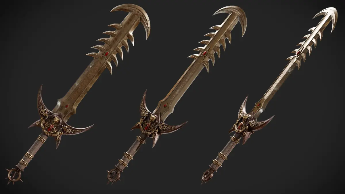 The fantasy sword is made in a dark style, ebony decorated with gold ornaments and skulls. Ideal for dark characters such as necromancer, knights, dark fantasy magican. Detailing allows the model to be used in games and game engines, while the quality is not inferior to high poly models.