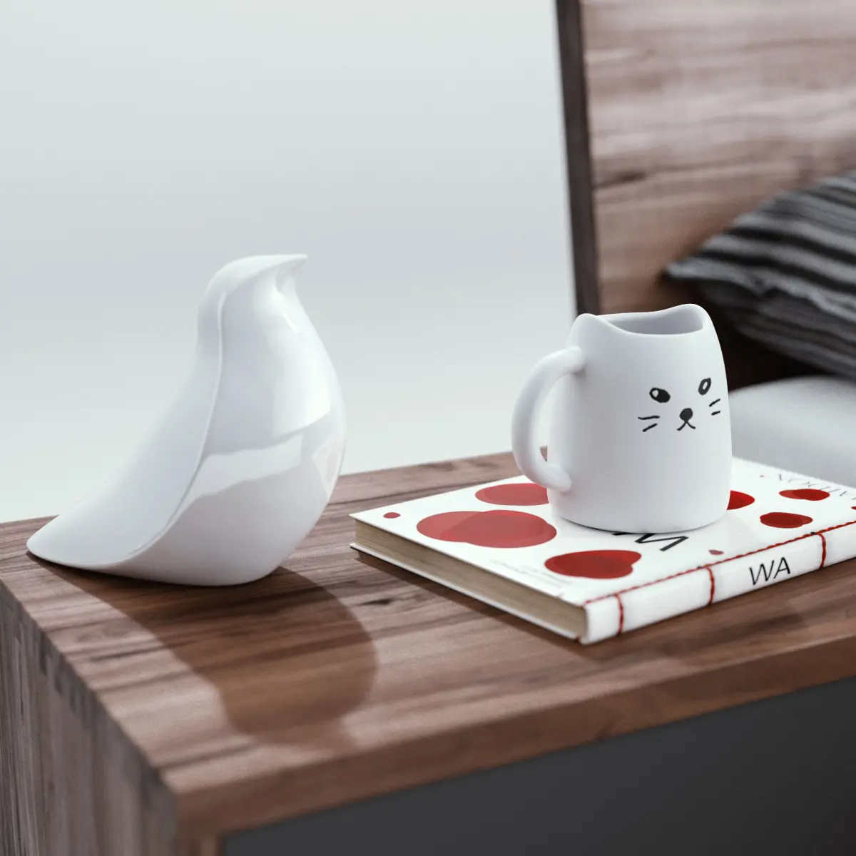 High quality model of RIVA 1920 Natura 6 bed, K-Blade lamp, Freedom;Miya Company Black and White Cat Mug Set;Urban Trends Ceramic Abstract Bird Sculpture;Phaidon books.