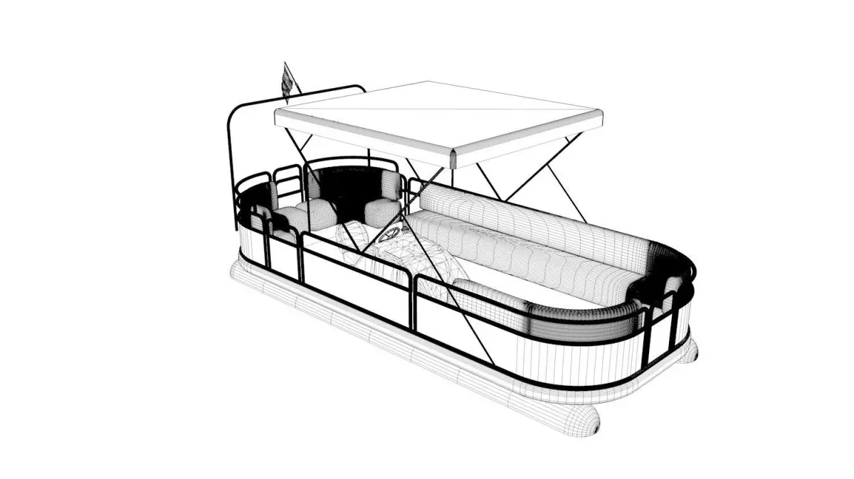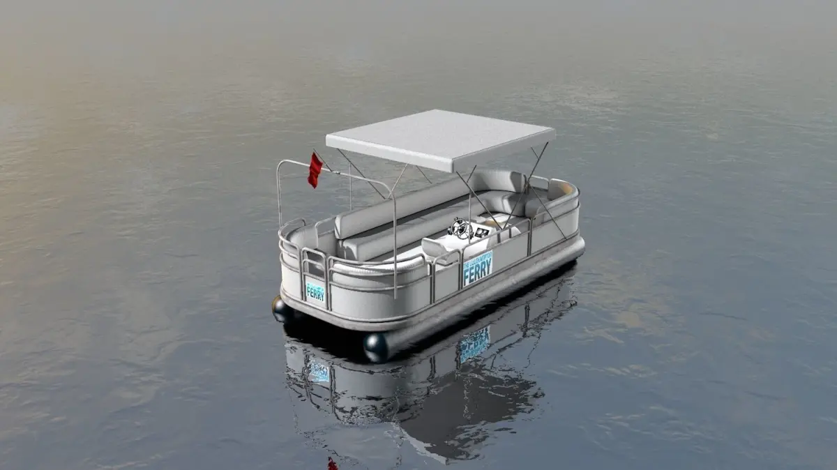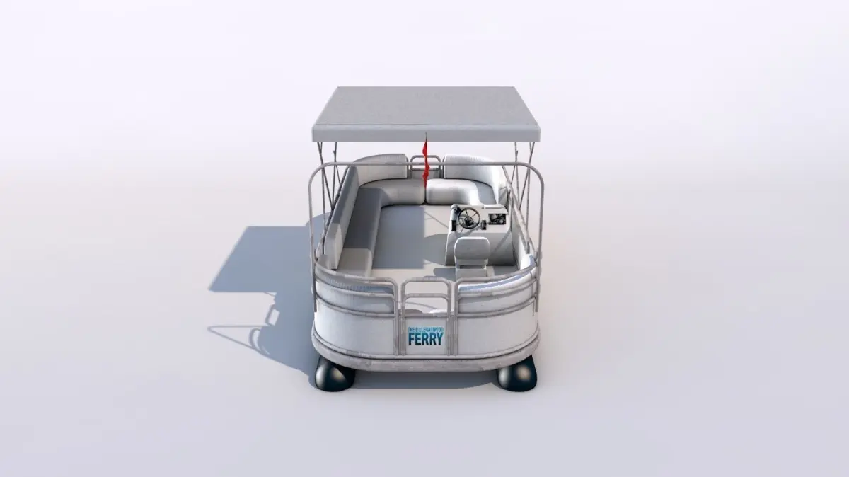 Small ferryboat used on small rivers, canals and lakes as public transport. Great to diversify waterfront and add credibility to the view. Logos and flag are easily replaceable, so that local signage can be used.