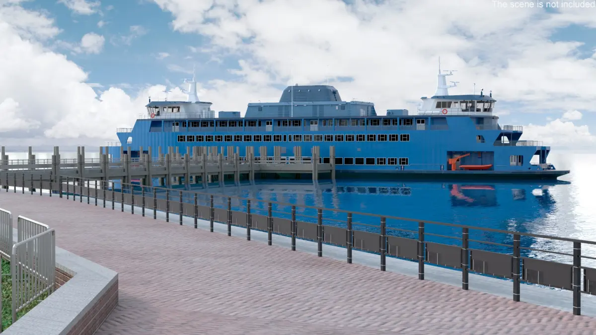 This model showcases a sleek, blue design with multiple decks and numerous windows for scenic views. The ferry is equipped with advanced navigation systems, safety features, and life-saving equipment such as lifeboats. The spacious layout ensures ample seating and amenities for passengers, making it ideal for long or short voyages.