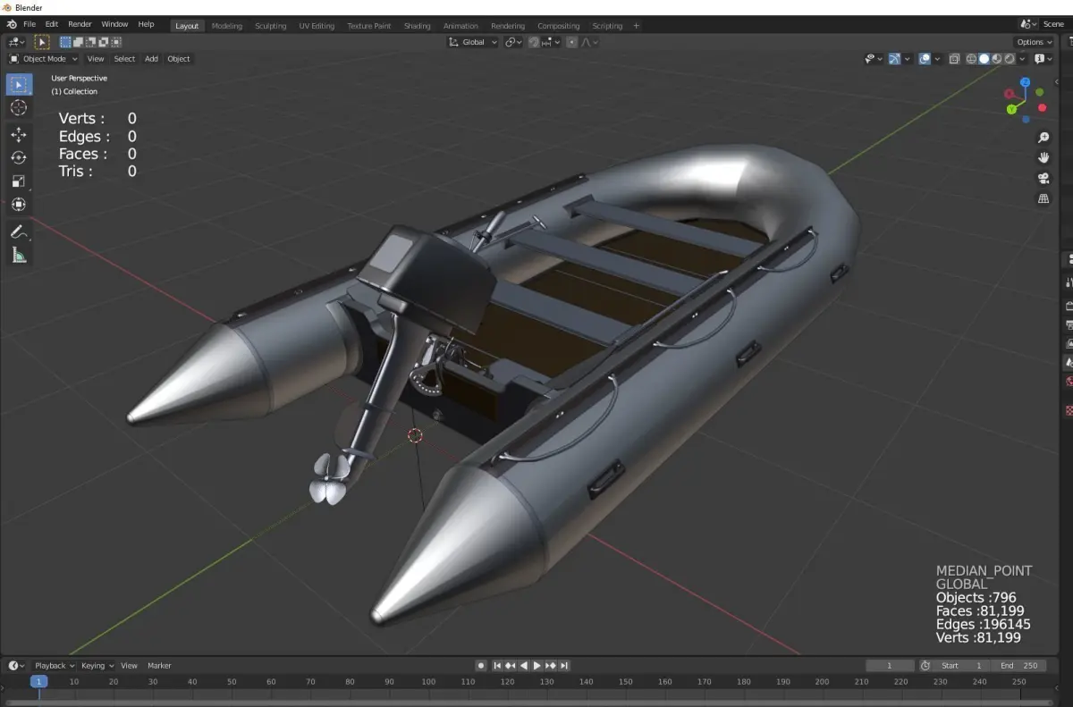 The River rubber boat 3D model design showcases a meticulously crafted virtual representation of a versatile and durable inflatable watercraft. This model captures the intricate details of a rubber boat, featuring a robust and buoyant structure that is ideal for navigating various water conditions. The design includes high-resolution textures, realistic materials, and precise geometries to replicate the tactile quality of rubber and the functional elements of the boat, such as reinforced seams, air valves, and oar locks. This 3D model serves as a valuable tool for visualizing the boat in different environments, providing a comprehensive view that aids in design, development, and marketing efforts, ensuring that every aspect of the boat is optimized for performance and aesthetic appeal.