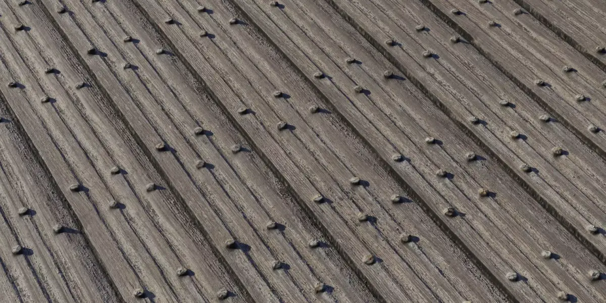 A distinctive, seamless PBR material featuring corrugated wooden planks reinforced with evenly spaced rivet-like metal studs—perfect for stylized industrial sets, rustic sheds, sci‑fi outposts, and prop dressing. The ribbed profile introduces strong directional lines that add depth and rhythm to walls, doors, fences, and modular panels, while the aged timber shows subtle greying, grain streaks, and edge burnish from long-term exposure. Authored for a metal/rough workflow, the pack includes calibrated 4K maps: Albedo/Base Color (no baked lighting), Normal for crisp rib channels, stud domes, and fine grain; Roughness tuned for dry weathered wood with slightly shinier metal heads; Height/Displacement to drive convincing corrugation and stud projection; and Ambient Occlusion to ground shadowing in grooves and fastener bases. Textures are square, power‑of‑two, and tile cleanly over large surfaces without visible repeats, maintaining close‑up fidelity like micro splinters and surface chatter. Use parallax or true displacement to emphasize rib depth, rotate UVs to vary flow direction, and tweak Roughness for dry sun‑bleached boards or damp, recently rained looks under HDRI lighting. Clean filenames and consistent channels ensure drop‑in compatibility with major DCCs and game engines. Deliverables: five 4096×4096 PNGs—BaseColor, Normal, Roughness, Height, AO—fully tileable and production ready.