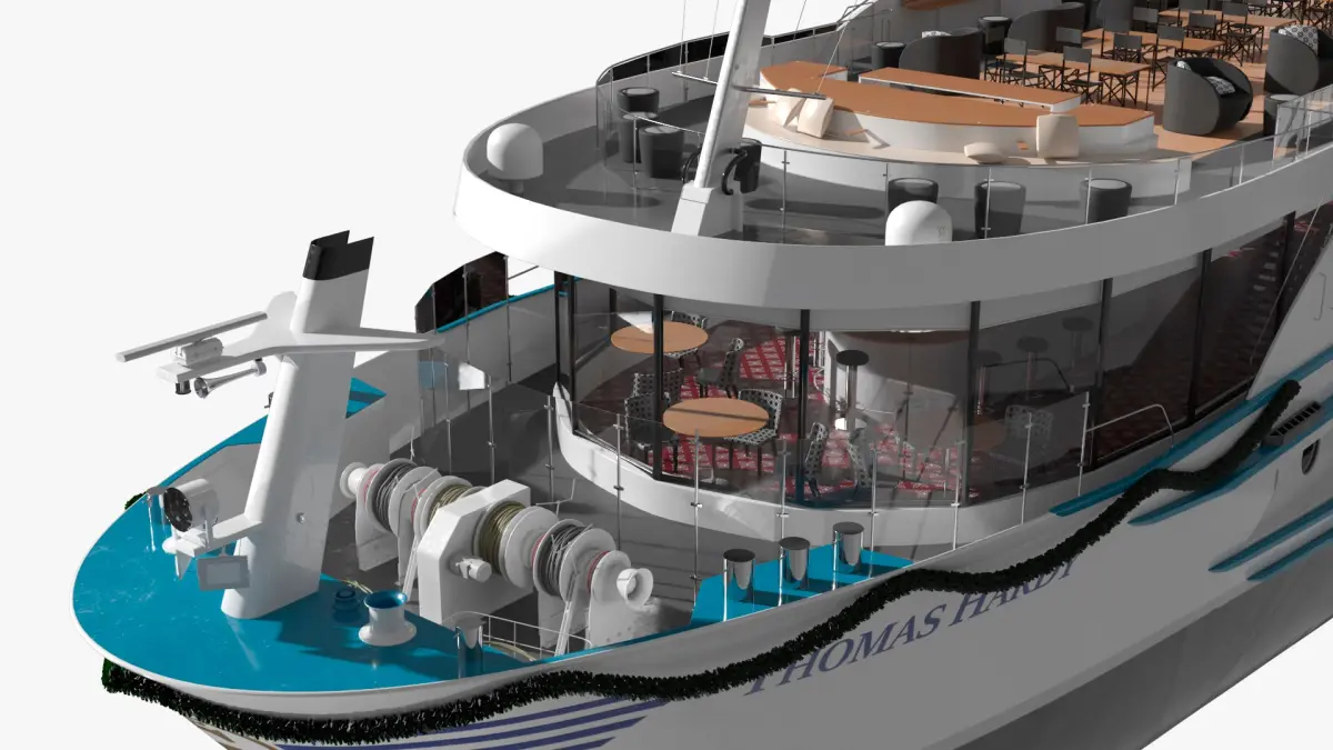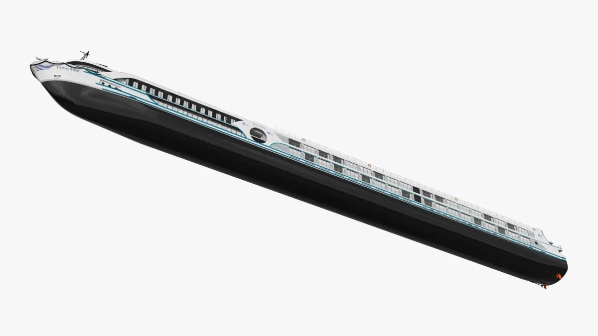 This model showcases a modern and sleek design with expansive decks, elegant dining areas, and panoramic windows for uninterrupted views. The ship features spacious cabins, a sun deck with comfortable seating, and a stylish lounge area, combining comfort with sophistication for an unforgettable cruising experience.