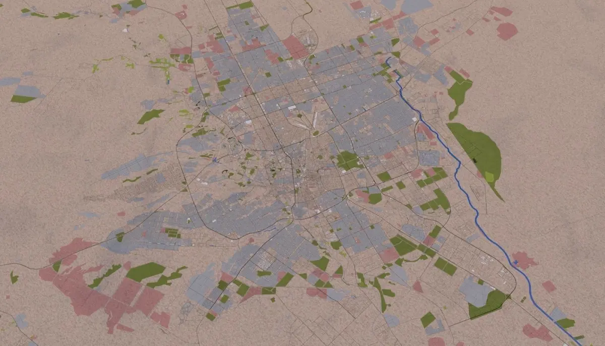 3D representation of Riyadh city_Kingdom of Saudi Arabia using 2019 October map data.This scene contains details of buildings, roads, land details, area details, airport, railway and water details.
