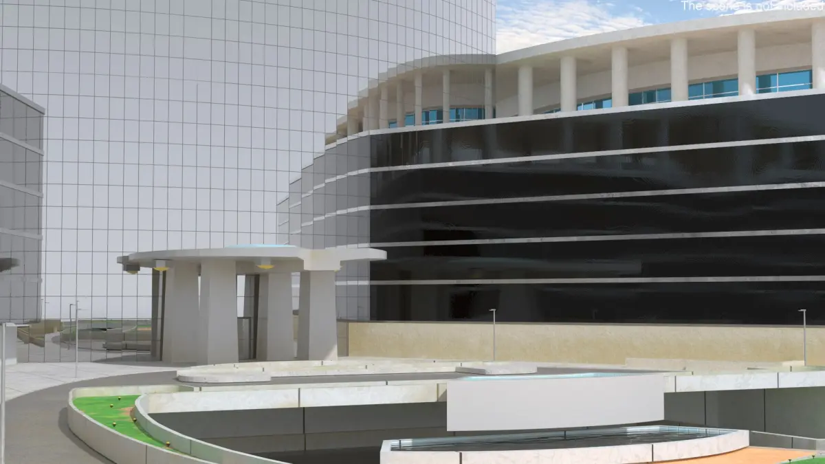 This digital model replicates the sleek, ultra-modern design of the skyscraper with its signature parabolic void near the top and a tapering form that emphasizes verticality and elegance. Surrounding structures and landscaped zones at the base are also modeled to provide context, making the complex suitable for cityscape integration. The reflective facade and clean geometrical lines are accurate to real-world proportions and visual details.