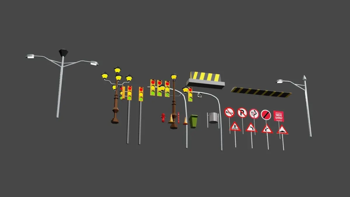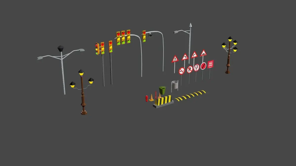 25 street assets pack lowpoly 3D models.Made with blender specially design for unity and unreal engine.Compatible with mobile devices, android and ios.Traffic lights, Street lights, Road signs, Road signals, Road cone, Road breaker, Road blocker, Dustbins, Water pump.MeshTris = 11668Verts = 6441
