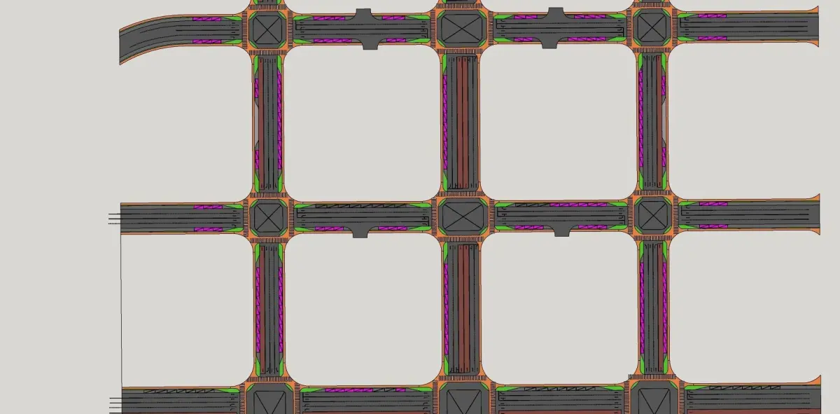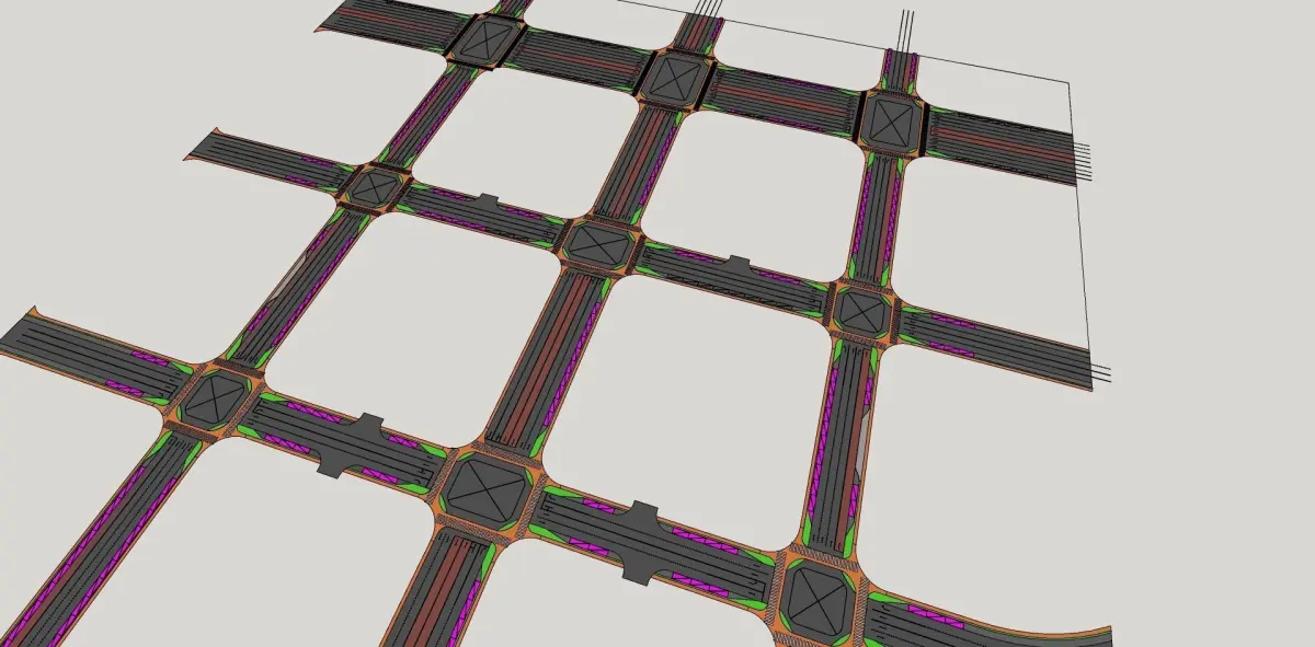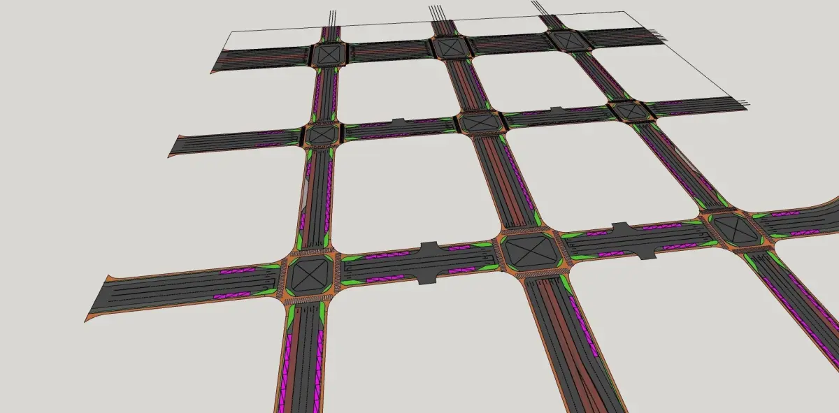 Road network 3d model includes greenlandroad lineswhite stripsbuffer zone
