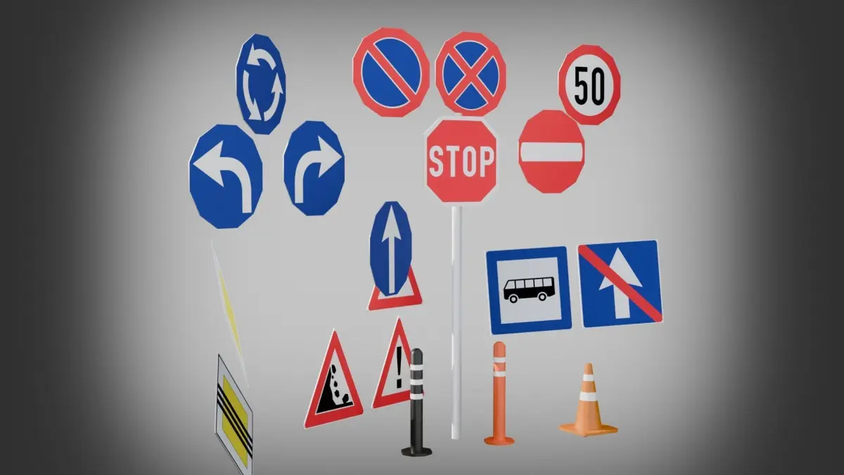 Game ready collection of various road objects and 20 various road signs such as:Cone,Sign pole,Tall orange coneTall black coneSquare signs - Bus stop, End of one way road, One way road, Parking, Pedestrian, Priority Road, End of Priority Road,Circle signs - Forward, Left, Right, Roundabout, Speed Limit, No Parking, No Entry, No Stopping and Parking,Triangle signs - Falling Stones, Give Way, Loose Chippings, Other DangersAnd the stop sign