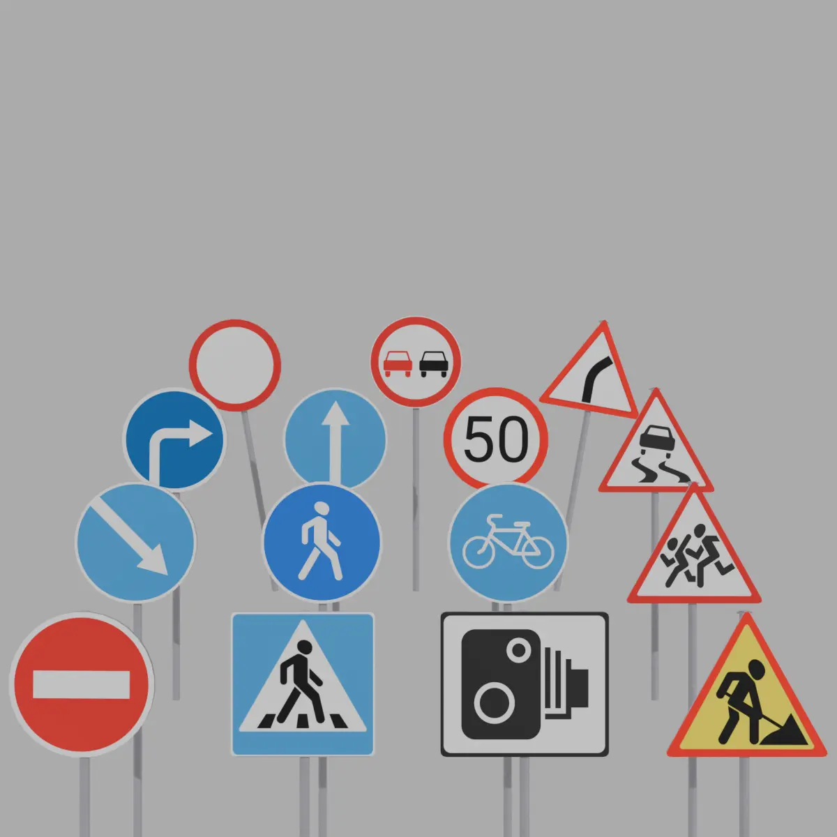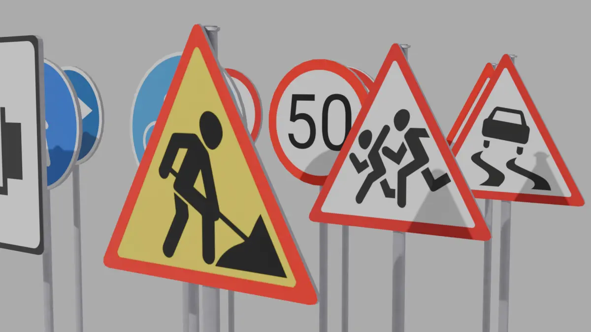 This is a detailed pack of 15 low-poly road signs, designed for game development, AR/VR, simulators, and visualizations. Each sign is a separate object with its own pivot point and clean topology.