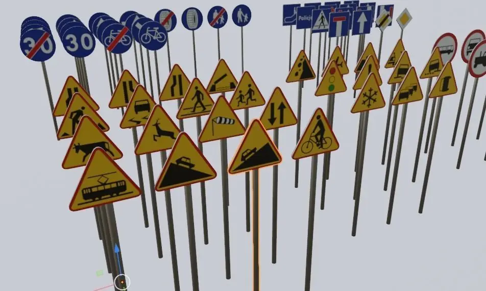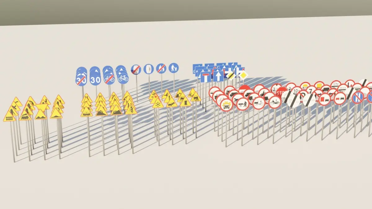 Basic pack of road signs.Extremely low poly. One sign have about 248-312 triangles.I will update this model with customizable numbers in Blender.Every sign have one additional edge to connect plate with pole