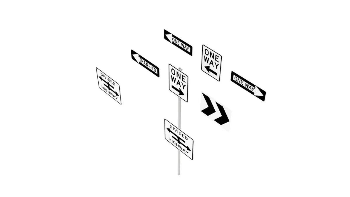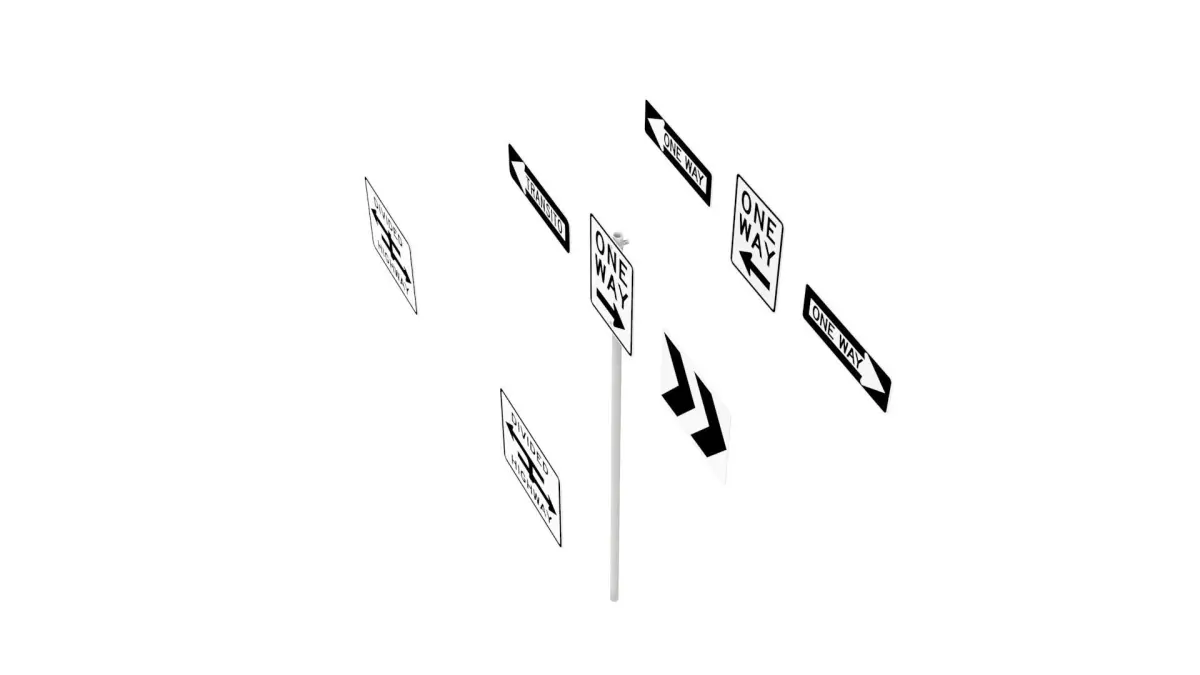 Features:2 Pole Types with Adjustable Height and Sign Brackets,Sign - MUTCD_R6-1L - One Way,Sign - MUTCD_R6-1R - One Way,Sign - MUTCD_R6-2L - One Way, Alternate,Sign - MUTCD_R6-2R - One Way, AlternateSign - MUTCD_R6-3 - Divided Highway Crossing,Sign - MUTCD_R6-3a - Divided Highway crossing T intersection,Sign - MUTCD_R6-4 - Chevron Roundabout Directional,Sign - Puerto_Rico_R6-1L - Transito (one way), Puerto Rico.