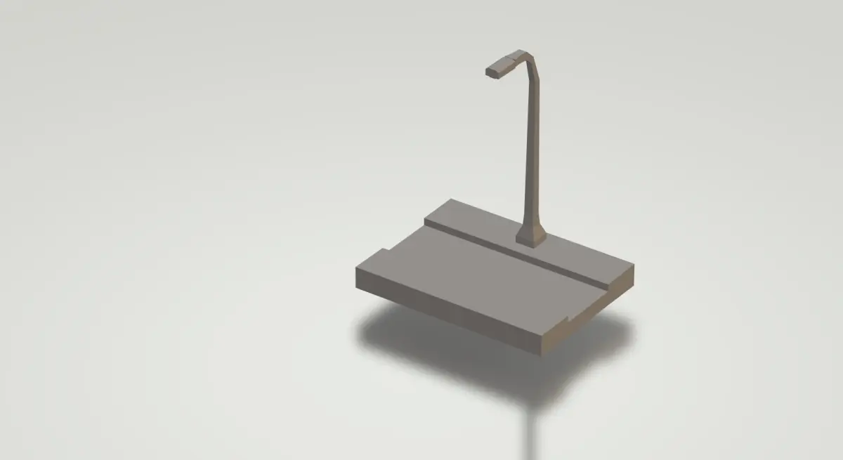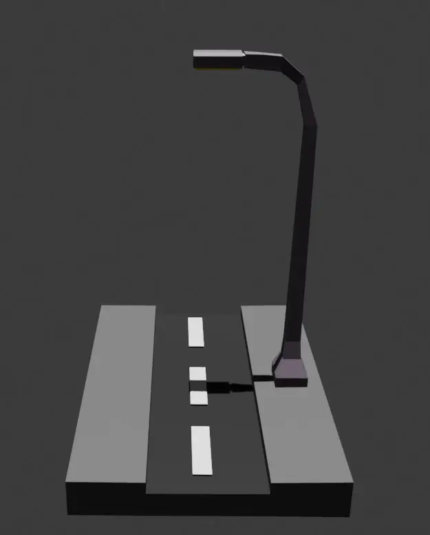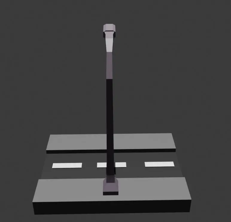 This is a low poly 3D model representing a straight street with raised sidewalks on the sides. The design uses simplified geometry with few polygons, resulting in an angular and minimalist look, typical of an urban road. The central part of the street is black, simulating asphalt, and features a division marked by dashed white lines, indicating traffic lanes. The raised sidewalks, in shades of light gray, run parallel along the sides of the street, adding a functional and stylized element to the scene. A lamppost, positioned on the right side, has a simple structure with a square base and a curved arm that supports the lamp, also in shades of dark gray. The shadow projected below the model reinforces the perception of depth and gives a stylized effect. This street model with sidewalks and lamppost is ideal for use in isometric games, such as urban simulators, strategy games or casual titles, where its low polygon count ensures optimized performance and allows for easy integration into larger scenarios, such as city maps or customizable road networks.