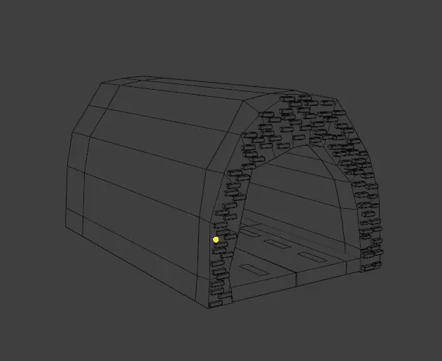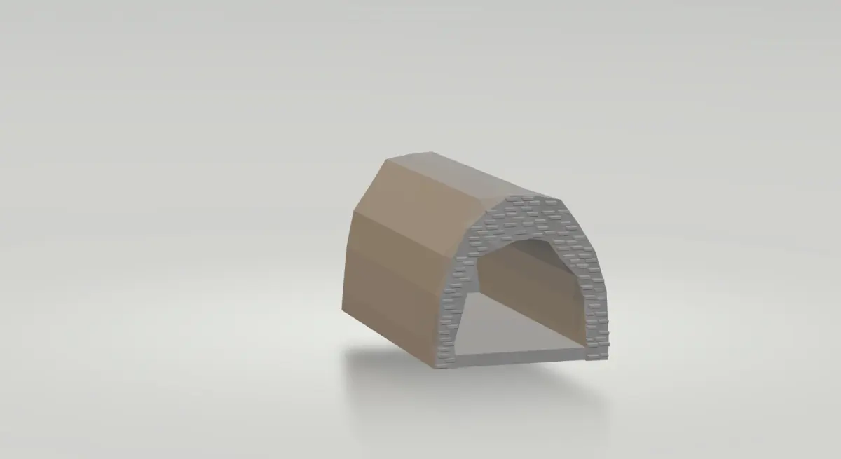 This is a low poly 3D model representing a tunnel with an integrated road, designed for urban or natural settings. The tunnel has an arched structure, with a semicircular entrance that suggests a robust construction, possibly made of stone or concrete, indicated by the blocky texture on the inner edges. The geometry is simplified, with few polygons, maintaining an angular and stylized look, typical of low poly design. The road that runs through the tunnel is flat and smooth, with a gray tone reminiscent of asphalt, and extends inside the structure, connecting the two ends of the tunnel. The exterior of the tunnel is composed of flat surfaces in a beige tone, giving the impression of a stylized mountain or rock that surrounds the passage. The shadow projected below the model reinforces the sense of depth and positioning. This tunnel and road model is ideal for use in games, especially isometric games such as driving simulators, strategy games or casual adventures, where its low polygon count ensures performance optimization and allows easy integration into larger scenarios such as road maps, mountain landscapes or stylized cities.