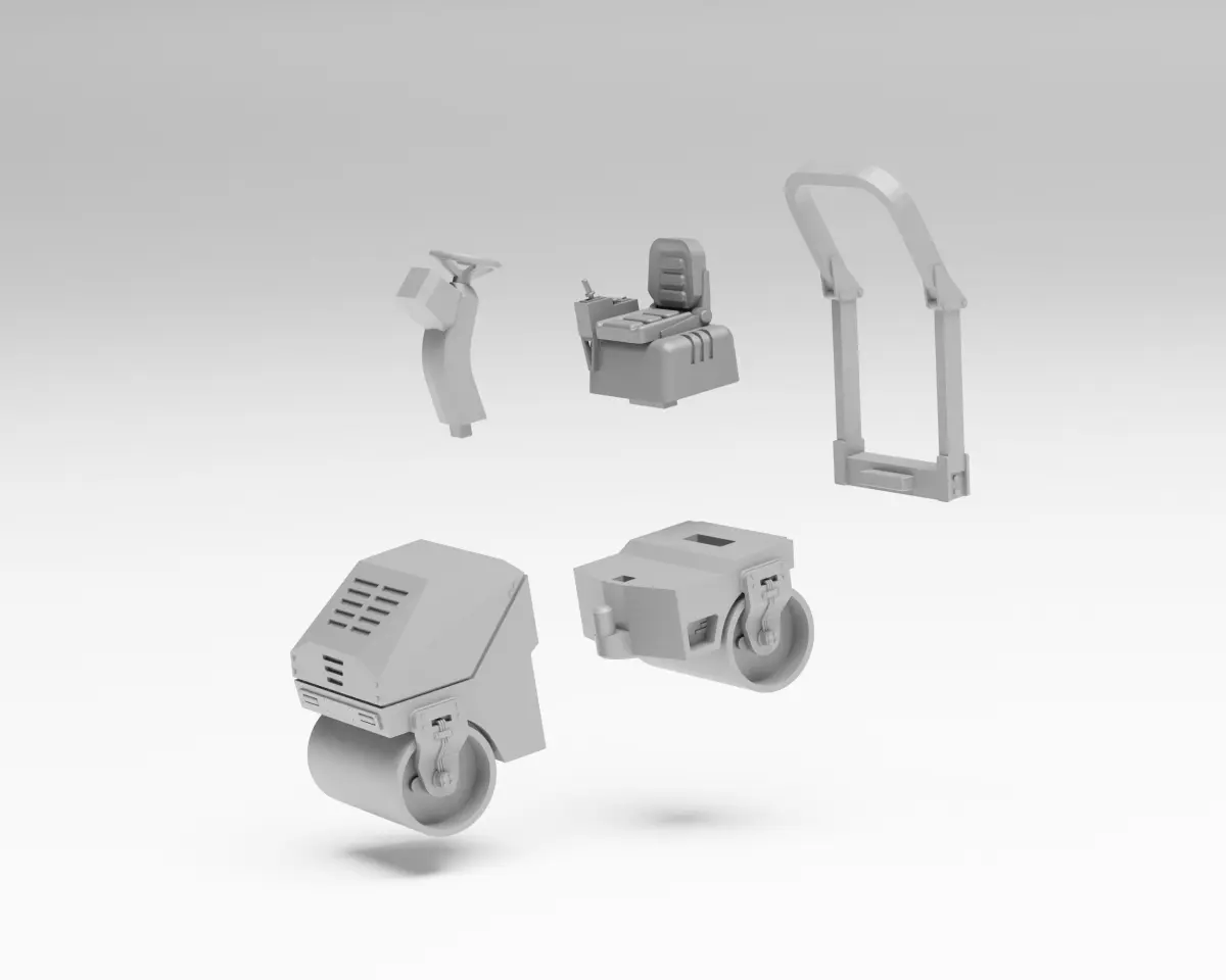 The main feture of this pack is a small asphalt roller kit. With its five carefully designed parts, you can recreate the authentic process of road construction.Included alongside the roller is a collection of essential accessories such as a traffic light, plastic road blocks, and traffic cones and a portable toilet, a must-have element found at all road construction sites. In total the pack includes 16 STL files.