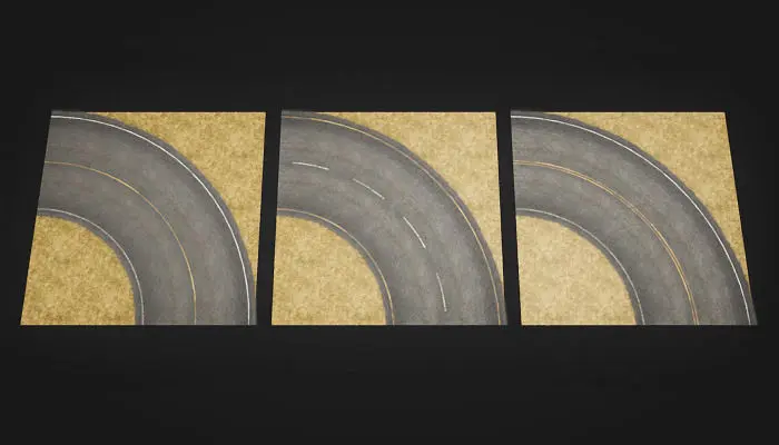 Every piece comes with both pavement (sidewalk) or grass edges, plus there are 3 different road line/marking variations (so 6 versions of every object in total).