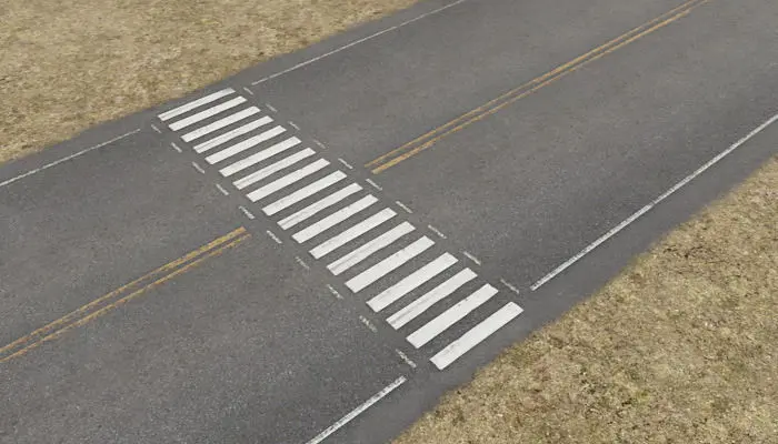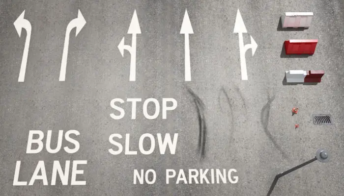 The pack includes a set of road overlays such as arrows, text and skid marks. There's also a selection of furniture objects such as lamp posts, crash barriers, drains and traffic cones.