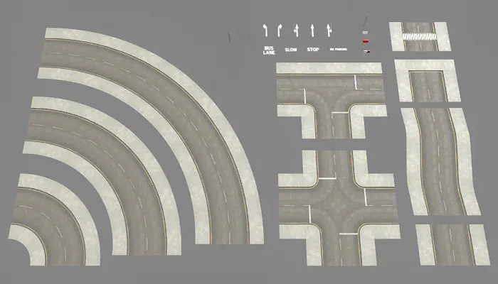 A set of road pieces and furniture that fit together in any orientation, enabling you to quickly construct a road or track.