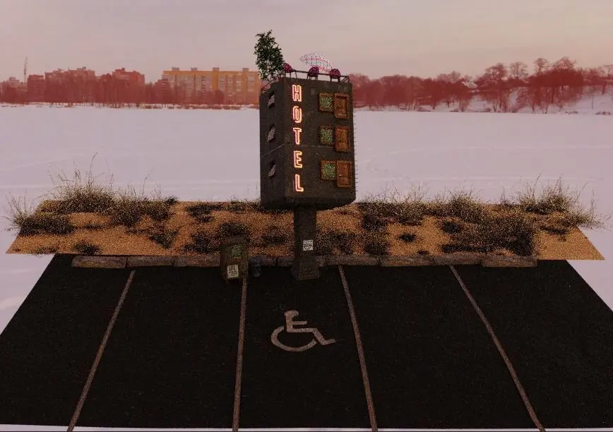 Roadside Hotel project, a bit surrealist with a touch of brutalism.Blender project, rendered in cycles. If you need any format or have issues contact me, i'll be glad to provide the necessary stuff. Thank you for passing by!