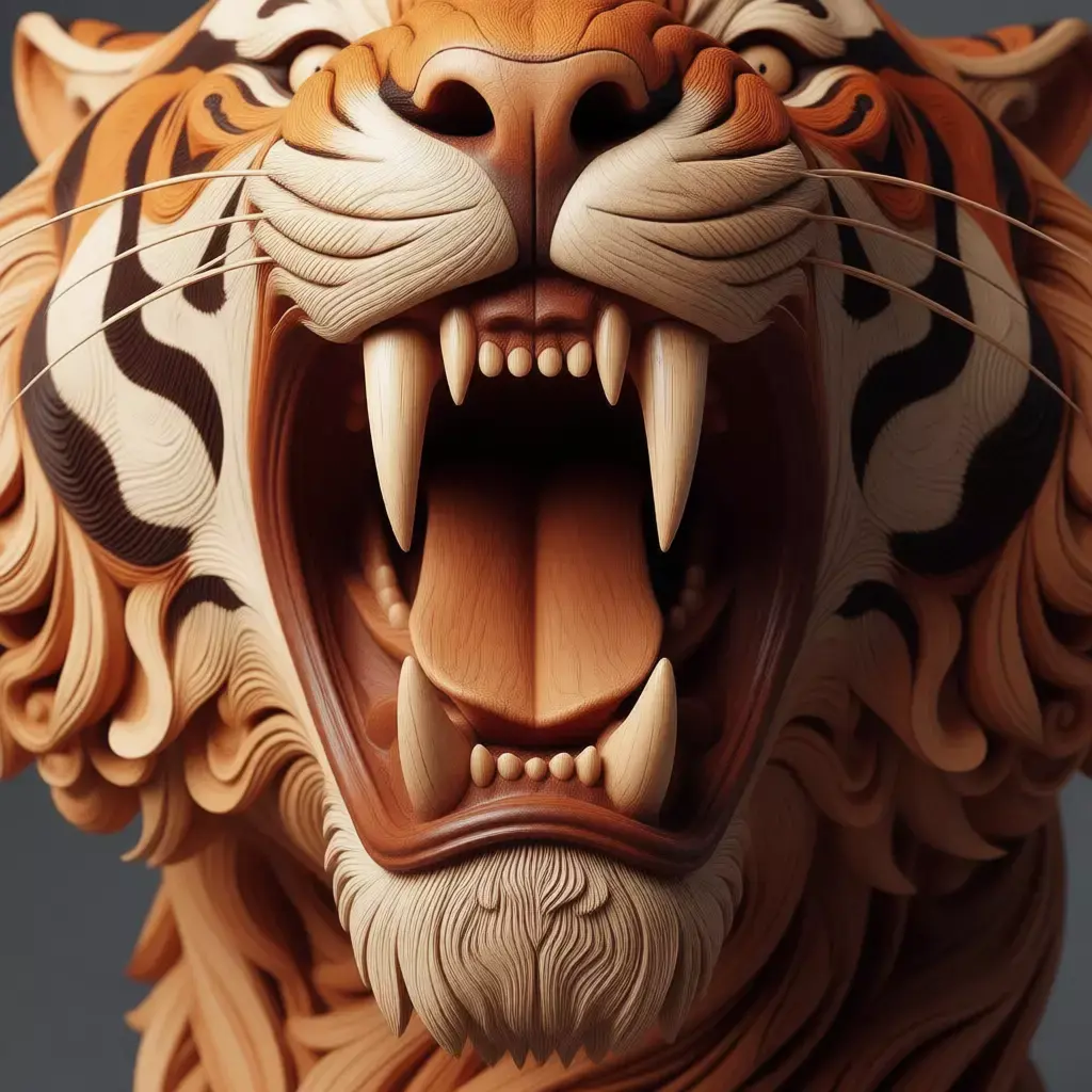 This 3D model captures the ferocity of a roaring tiger, sculpted in detailed wood grain with dramatic swirling patterns that mimic flowing fur and muscle movement. The tiger’s open mouth, sharp teeth, and intense gaze evoke raw power, while its curved mane and textured stripes add depth and dynamism. The sculpture stands on a simple wooden base, grounding its wild energy. Key attributes include:
