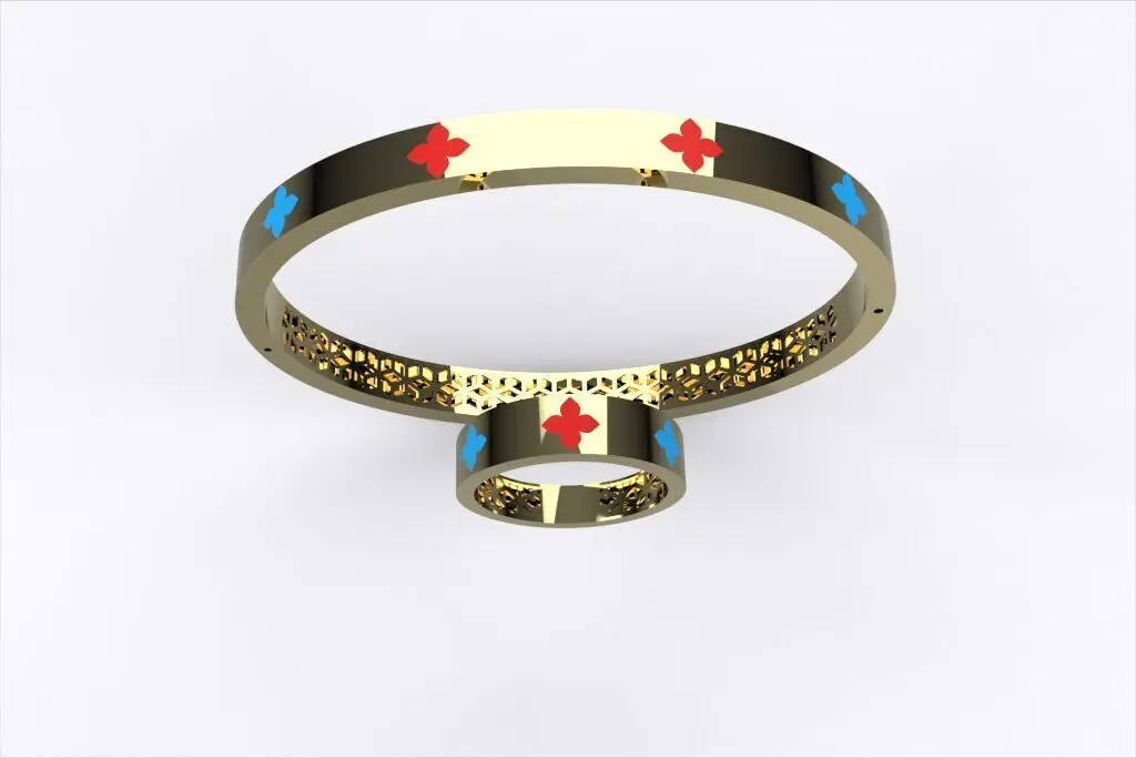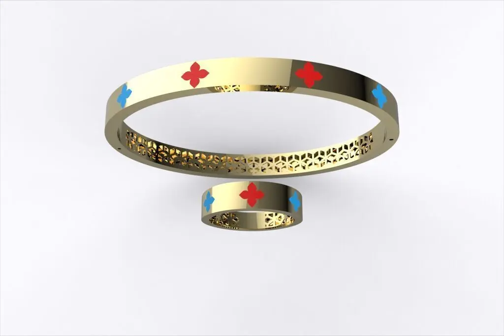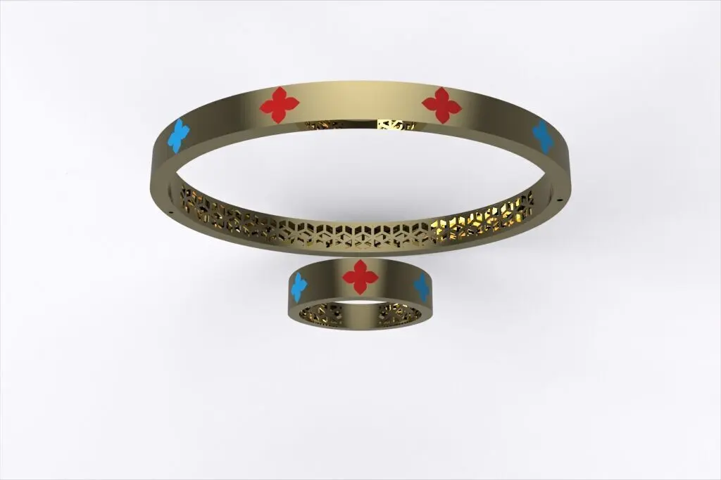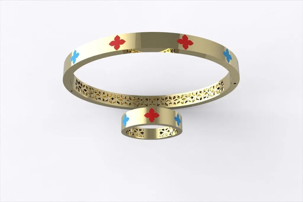 This luxurious 3D jewelry set includes a wide gold bracelet and matching ring, both featuring a modern yet timeless design. The outer surface is adorned with delicate diamond-pattern clusters, while the inner band reveals an intricate geometric lattice, combining elegance with complexity. Perfect for high-end digital collections or real-world 3D printing in fine jewelry. Clean topology and manufacturing-ready file formats make this set ideal for designers and jewelers seeking premium and customizable assets.