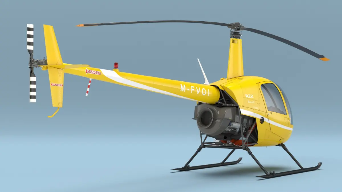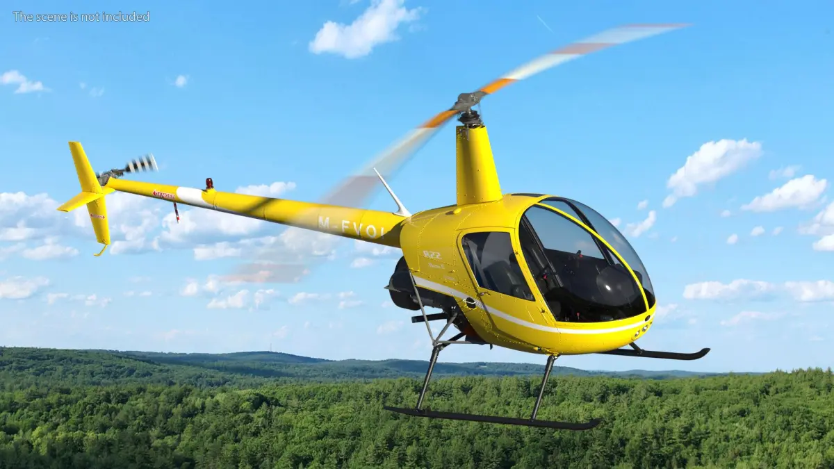 This helicopter model features a sleek, aerodynamic shape with a vivid yellow body and a compact two-seat cockpit. It includes detailed components such as rotor blades, landing skids, and a glass canopy, accurately reflecting the design elements of the Robinson R22 helicopter. The model emphasizes realism with its precise detailing and textures.