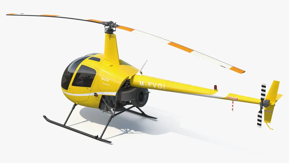 Robinson R22 Light Helicopter Yellow is a 3d model of a small helicopter, showcasing a lightweight, efficient rotorcraft design commonly used for training and private flying.